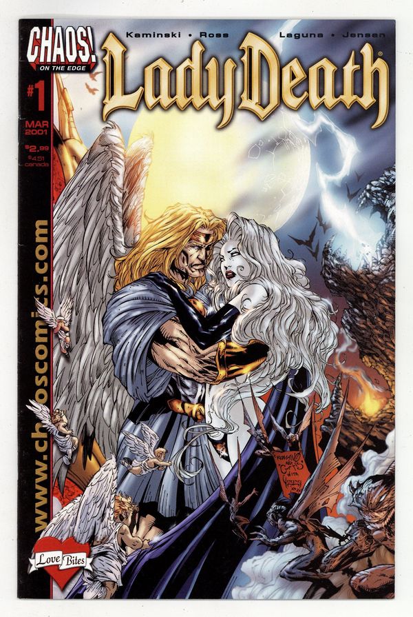 by Len Kaminski & Peter Vale. When love bites, love is dangerous! Join us this Valentine's Day as we look into Lady Death's past and uncover a secret story of forbidden romance. Learn about the fateful encounter between two forces of nature: the Diva of Death and the archangel Michael. Are these two destined to be soul-mates or mortal enemies? Cover by Romano Molenaar, Curtis Arnold, and Roy Young. FC, 32pg Cover price $2.99.