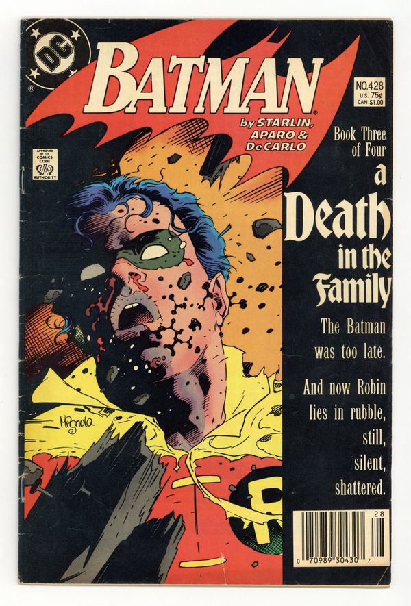 Ends Mar 9 7:32 PM CST Bid History 3 bids Current Bid $13 Your Secret Max Bid If you'd like to bid, please log in or register. First printing. Newsstand Edition. Cover art by Mike Mignola. "A Death in the Family" part 3 of 4, script by Jim Starlin, pencils by Jim Aparo, inks by Mike DeCarlo; Death of Sheila Haywood; Burial of Sheila Haywood and Jason Todd; The Joker becomes the Iranian Ambassador to the U.N. Results of Phone Poll as to whether Robin dies this issue or not. NOTE: Most issues from 397-432 were reprinted in 1989 and sold in multipacks. These 2nd and 3rd prints have back cover ads dated 1989. 36 Pages, Full Color. Cover price $0.75.