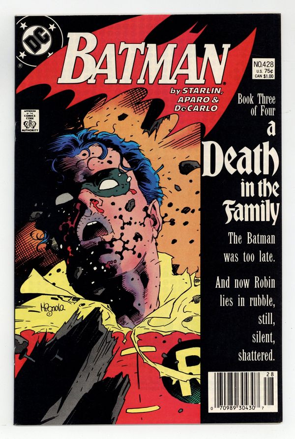Ends Apr 27 7:29 PM CST Bid History 4 bids Current Bid $20 Your Secret Max Bid If you'd like to bid, please log in or register. First printing. Newsstand Edition. Cover art by Mike Mignola. "A Death in the Family" part 3 of 4, script by Jim Starlin, pencils by Jim Aparo, inks by Mike DeCarlo; Death of Sheila Haywood; Burial of Sheila Haywood and Jason Todd; The Joker becomes the Iranian Ambassador to the U.N. Results of Phone Poll as to whether Robin dies this issue or not. NOTE: Most issues from 397-432 were reprinted in 1989 and sold in multipacks. These 2nd and 3rd prints have back cover ads dated 1989. 36 Pages, Full Color. Cover price $0.75.