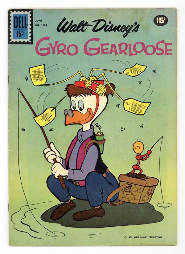 Gyro GearlooseCover art by Carl Barks. Monsterville; Duckburg is rebuilt to Gyro's specifications, but his inventions eliminate so much work that the people have nothing to do. The Cube; Gyro tries to find a use for the large plastic cube with holes that he has invented. Mighty But Miserable; A Beagle Boy forces Gyro to increase his intelligence, but the machine's effects last only an hour. Brain-strain; Gyro is marooned with Donald on a rocky island when Donald's poorly constructed boat sinks. Scripts by Vic Lockman, art by Carl Barks. 36 pages, full color. Cover price $0.15.