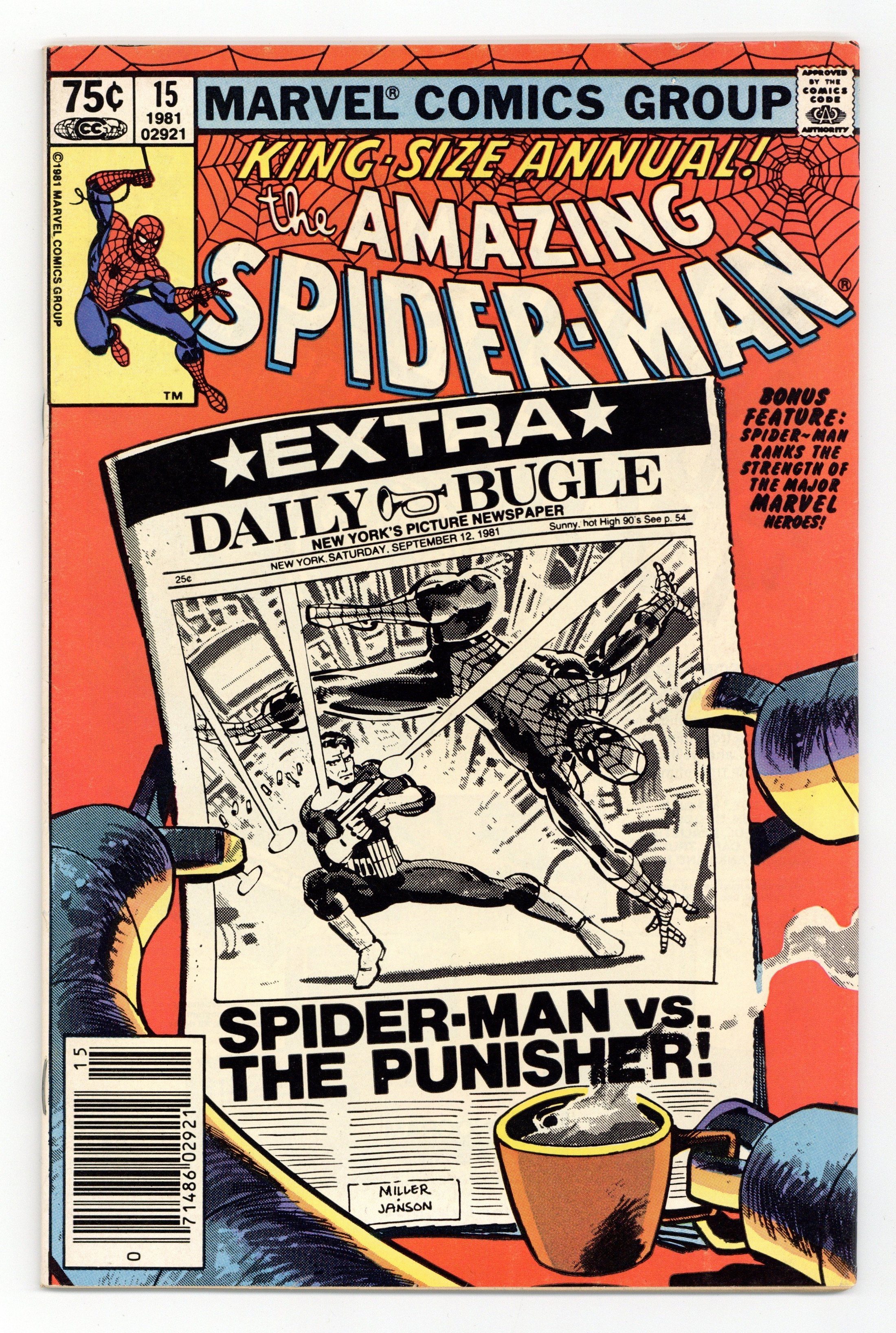 Newsstand Edition. "Spider-Man: Threat or Menace?" Guest-starring the Punisher. Script by Denny O'Neil. Art by Frank Miller (breakdowns) and Klaus Janson (finishes). Cover by Frank Miller and Klaus Janson. The dynamic art tandem that took the Daredevil series to new heights in the early 1980's teams up to bring Spider-Man and the Punisher together again! But this time the web-slinger and the gun-toting vigilante are not facing the likes of Jigsaw or the Hitman! Their adversary is a certain six-armed super-villain...planning nothing less than the murder of five million people! The Punisher takes the first shot at Dr. Octopus in the city morgue! And later on the wondrous wall-crawler takes the last one at the Daily Bugle! Can Spidey get the story to press before Doc Ock? An excellent annual! Second feature: "Just How Strong Is...Spider-Man?" Script by Mark Gruenwald. Art by Mark Gruenwald (layouts) and Bob Layton (finishes). The heroes of the Marvel Universe are ranked in order of their physical strength. The first tier consists of the Hulk, Hercules, Thor, Wonder Man, and Iron Man. The Thing and the Sub-Mariner headline the second tier. Spider-Man is in the third tier. This may be the first such "power ranking" attempted...thus making it a landmark backup feature. Third feature: "Peter Parker's Apartment!" Script by Roger Stern. Art by Marie Severin and Terry Austin. One-page illustration of Peter's Chelsea apartment correcting the errors in Amazing Spider-Man Annual 13. Fourth feature: "A Gallery of Spider-Man's Most Famous Foes!" Script by Roger Stern. Art by Keith Pollard, Greg LaRocque, and Frank Giacoia. 4 pages of pin-ups featuring the Man-Wolf, Jackal, Punisher, and Tarantula. (Notes: Dr. Octopus previously appeared in Captain America 259. The Punisher appears next in Daredevil 181 & 182. This story was reprinted in the trade paperback The Sensational Spider-Man (1988); and also in the (1994) Complete Frank Miller Spider-Man.) 52 pages. Cover price $0.75.