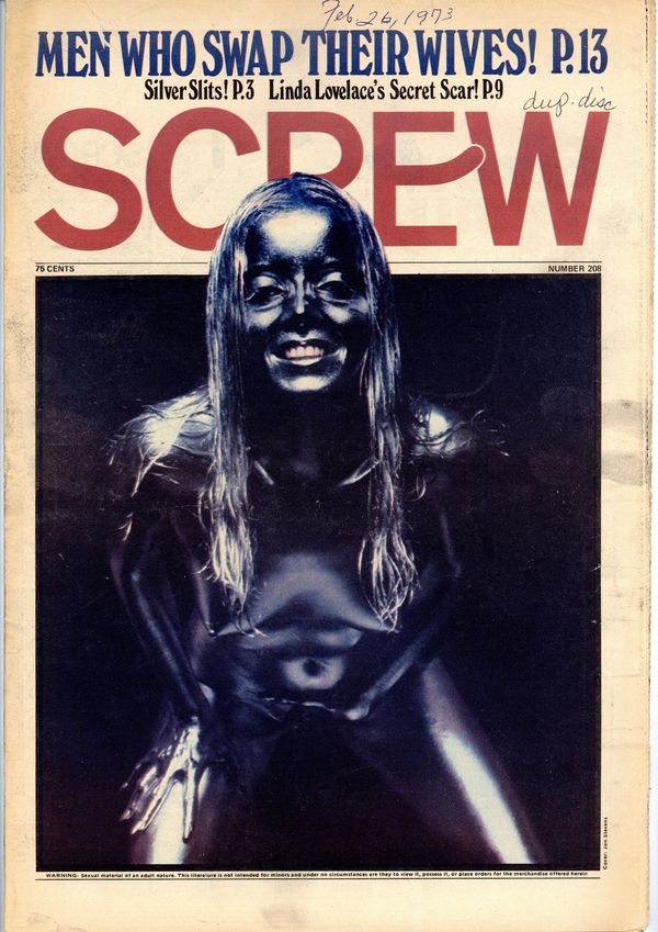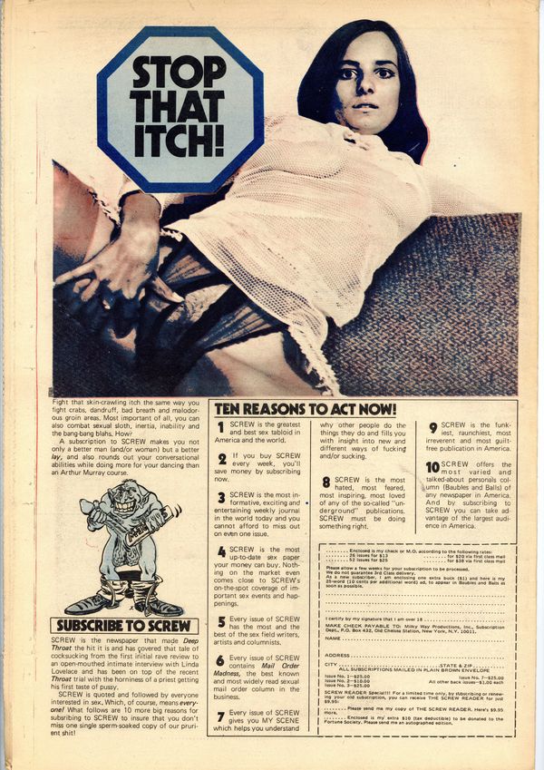 Screw was a weekly tabloid newspaper published and edited by Al Goldstein and his Milky Way Productions. This New York based publication was notable for being a pioneer in bringing hardcore pornography into the American mainstream during the late 1960s and early 1970s. Cover by Jon Stevens. Tabloid format, 11.5" x 16.75", 32 pages, B&W. ADULT MATERIAL Cover price $0.75.