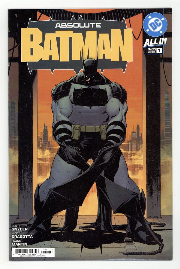 Written by Scott Snyder. Art by Nick Dragotta. Cover by Nick Dragotta. BATMAN LEGEND SCOTT SNYDER AND ICONIC ARTIST NICK DRAGOTTA TRANSFORM THE DARK KNIGHT'S TALE FOR THE MODERN AGE! Without the mansion...without the money...without the butler...what's left is the Absolute Dark Knight! 44 pages, full color. Rated T+ Cover price $4.99.