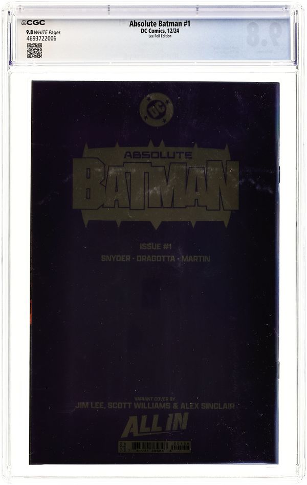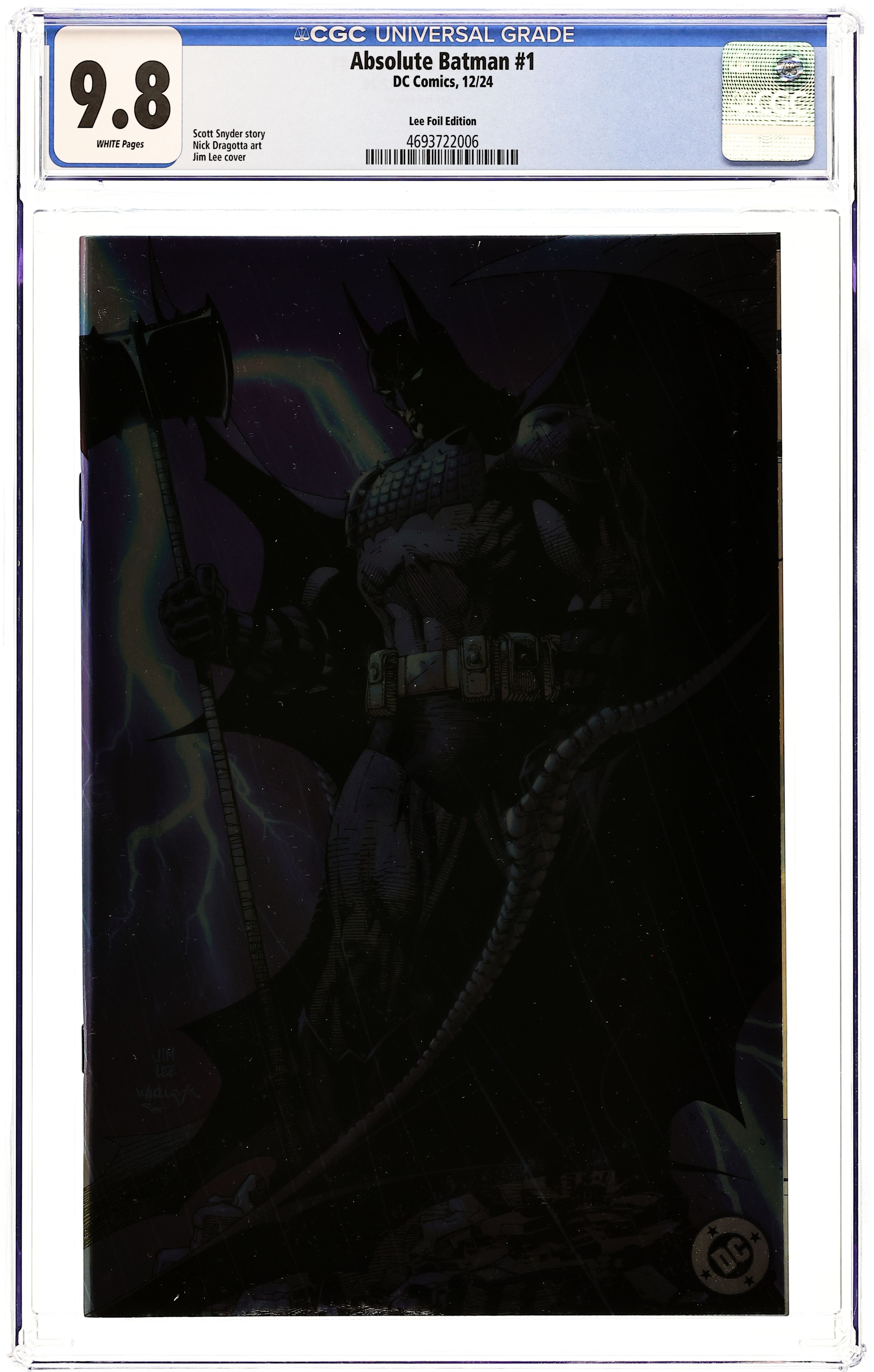 Foil Cover. Written by Scott Snyder. Art by Nick Dragotta. Cover by Jim Lee. BATMAN LEGEND SCOTT SNYDER AND ICONIC ARTIST NICK DRAGOTTA TRANSFORM THE DARK KNIGHT'S TALE FOR THE MODERN AGE! Without the mansion...without the money...without the butler...what's left is the Absolute Dark Knight! 48 pages, full color. Rated T+ Cover price $7.99.