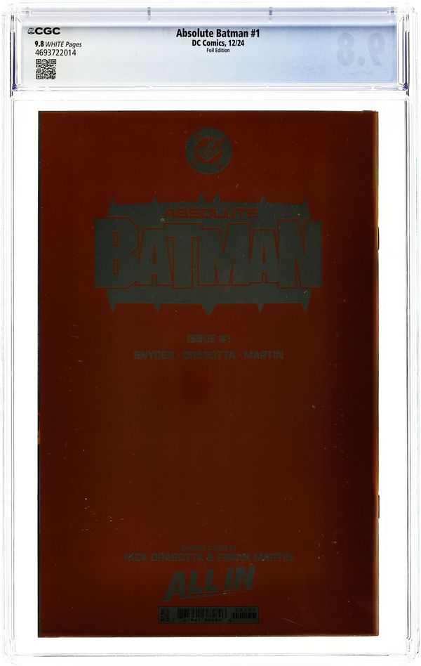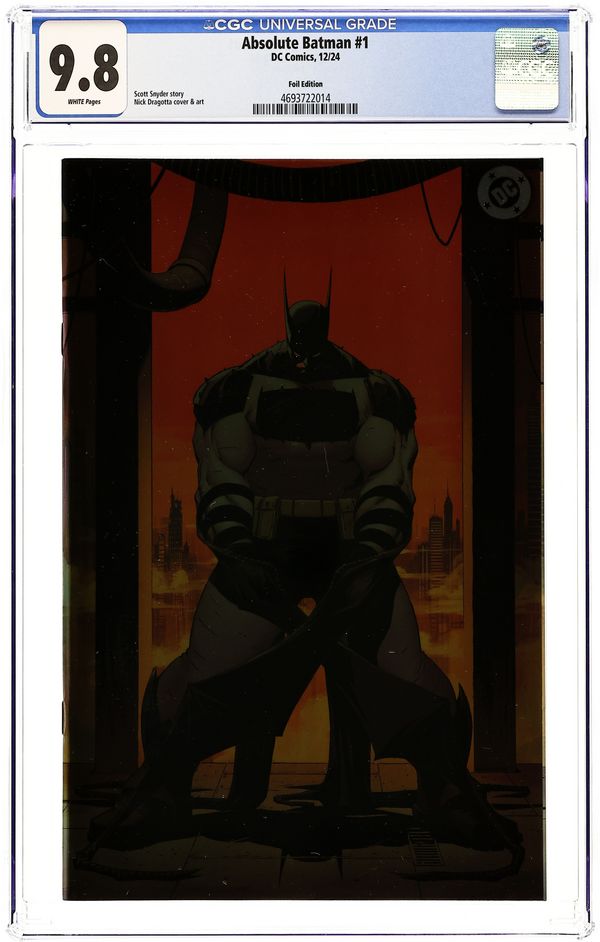 Foil Cover. Written by Scott Snyder. Art by Nick Dragotta. Cover by Nick Dragotta. BATMAN LEGEND SCOTT SNYDER AND ICONIC ARTIST NICK DRAGOTTA TRANSFORM THE DARK KNIGHT'S TALE FOR THE MODERN AGE! Without the mansion...without the money...without the butler...what's left is the Absolute Dark Knight! 48 pages, full color. Rated T+ Cover price $7.99.
