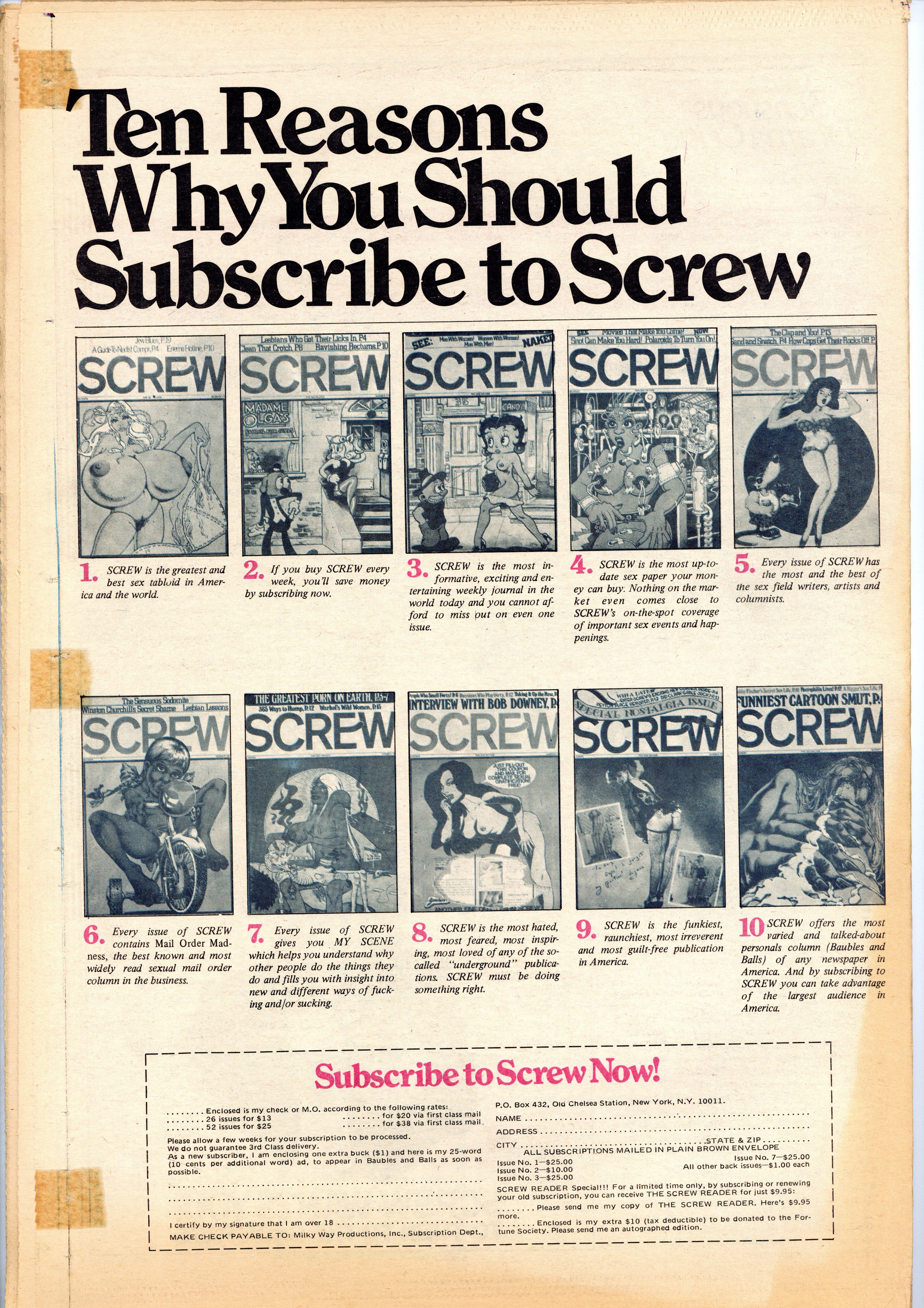 Published Dec 1972 by Milky Way Productions.$3.00Screw was a weekly tabloid newspaper published and edited by Al Goldstein and his Milky Way Productions. This New York based publication was notable for being a pioneer in bringing hardcore pornography into the American mainstream during the late 1960s and early 1970s. Cover by Jerry Zimmerman. Tabloid format, 11.5" x 16.75", 32 pages, B&W. ADULT MATERIAL Cover price $0.75.