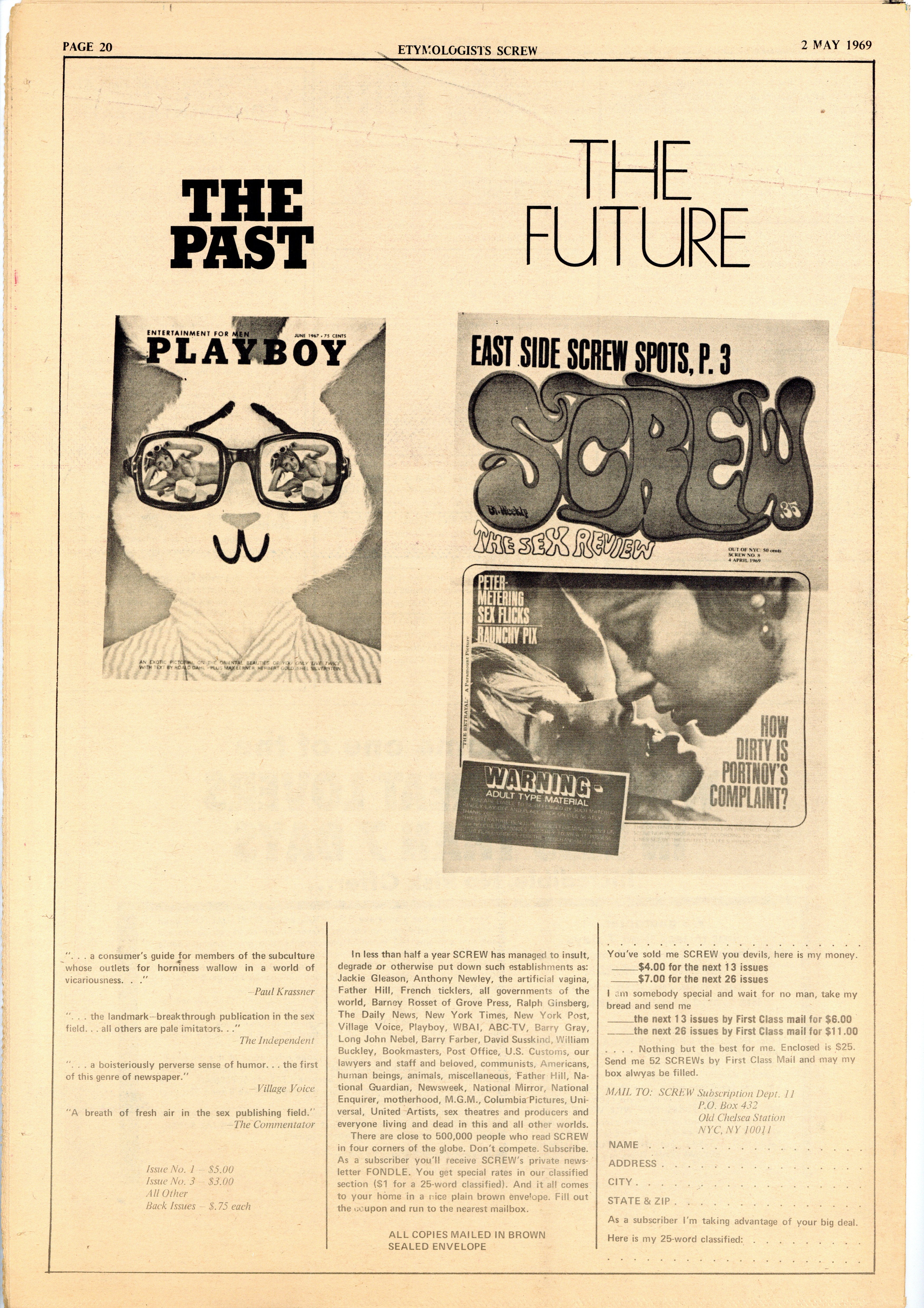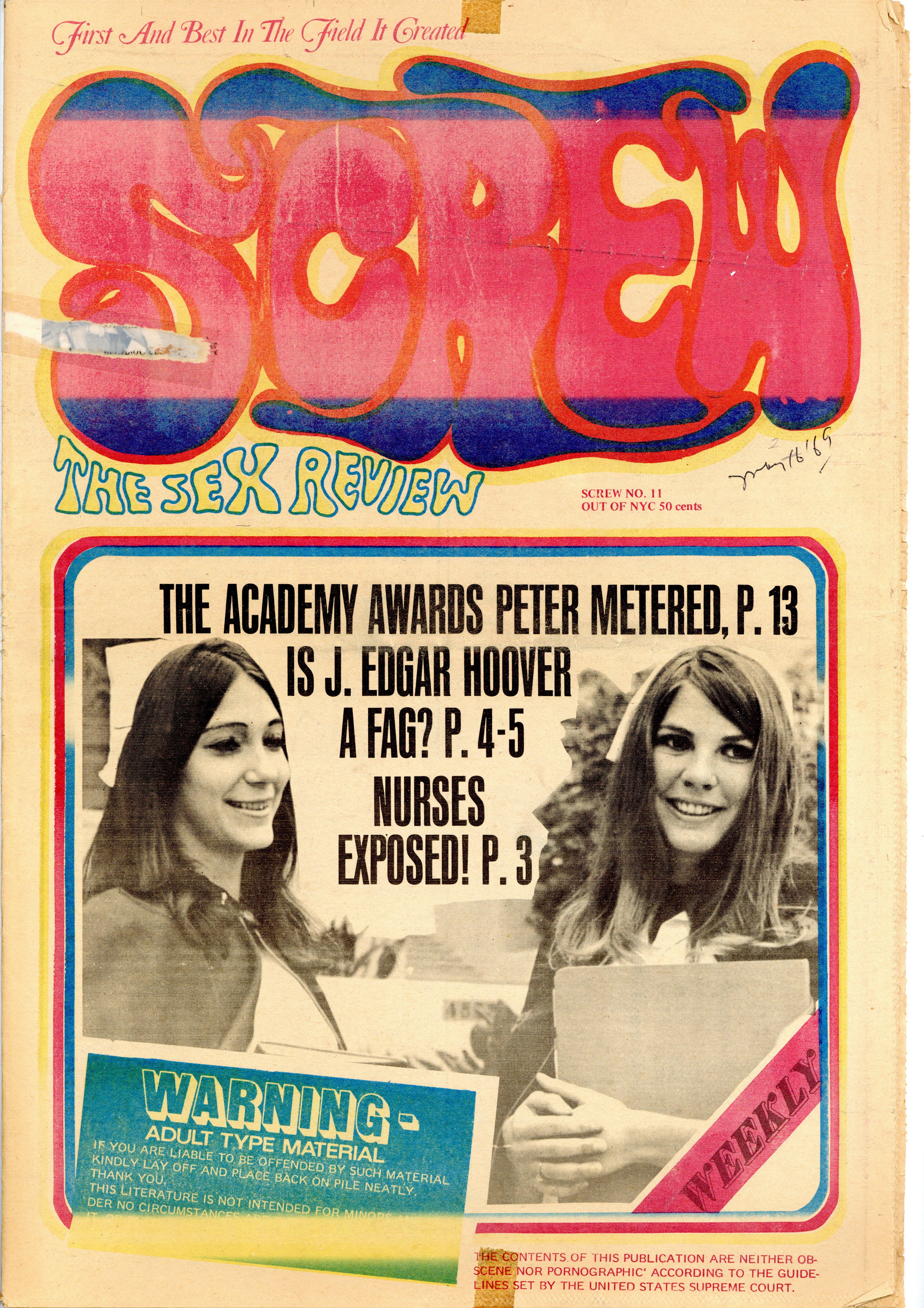Published May 1969 by Milky Way Productions.$4.30Screw was a weekly tabloid newspaper published and edited by Al Goldstein and his Milky Way Productions. This New York based publication was notable for being a pioneer in bringing hardcore pornography into the American mainstream during the late 1960s and early 1970s. Tabloid format, 11.5" x 16.75", 20 pages, B&W. ADULT MATERIAL Cover price $0.35.