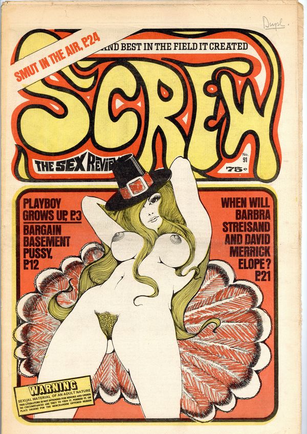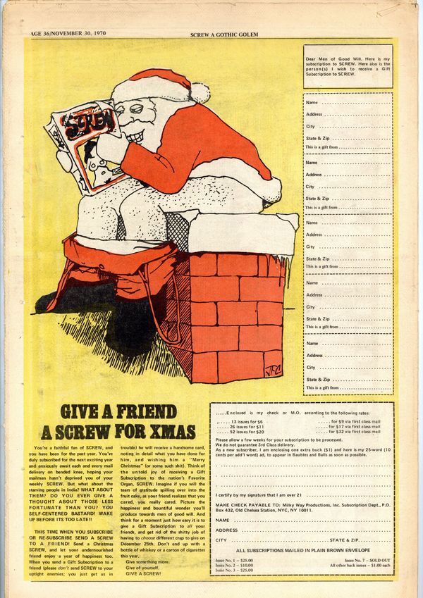 Published Nov 1970 by Milky Way Productions.$9.60Screw was a weekly tabloid newspaper published and edited by Al Goldstein and his Milky Way Productions. This New York based publication was notable for being a pioneer in bringing hardcore pornography into the American mainstream during the late 1960s and early 1970s. Tabloid format, 11.5" x 16.75", 36 pages, B&W. ADULT MATERIAL Cover price $0.75.