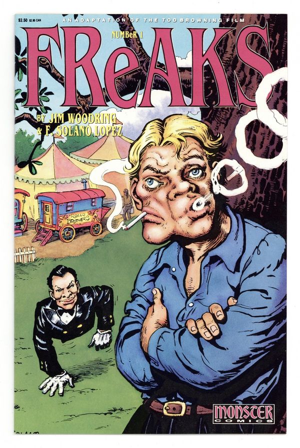 Part 1 of the officially licensed adaptation of the 1932 Tod Browning horror classic. Beautiful but cruel trapeze artist Cleopatra toys with the affections of midget Hans, but this does not sit well with the other members of their traveling sideshow. Written by Frank cartoonist Jim Woodring and drawn by Argentine artist Francisco Solano Lopez. Black and white; 28 pages. Cover price $2.50. Cover price $2.50.