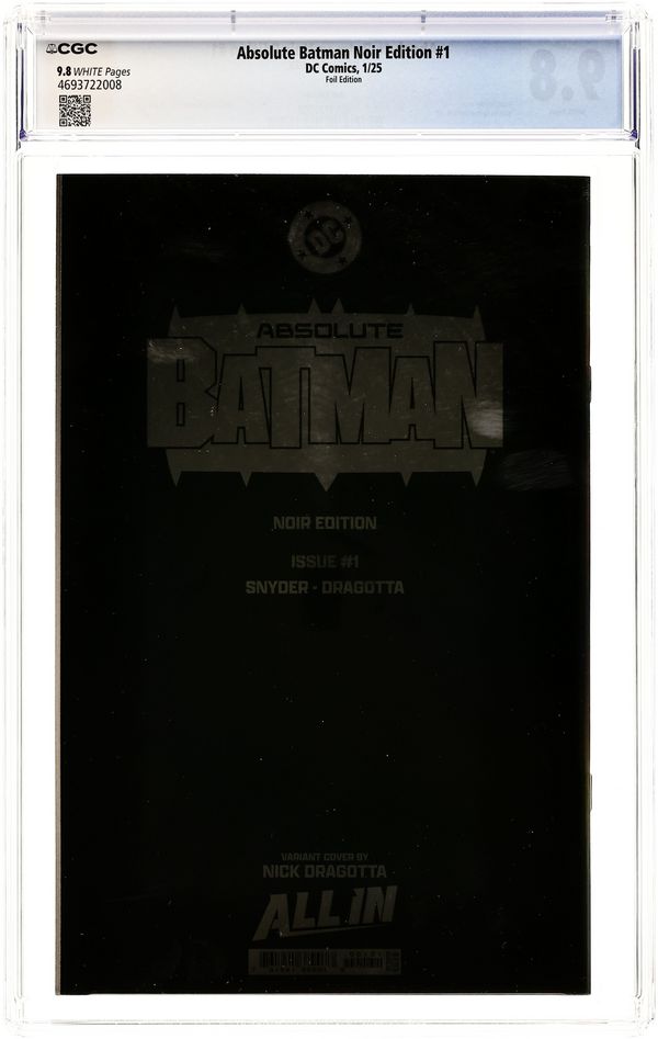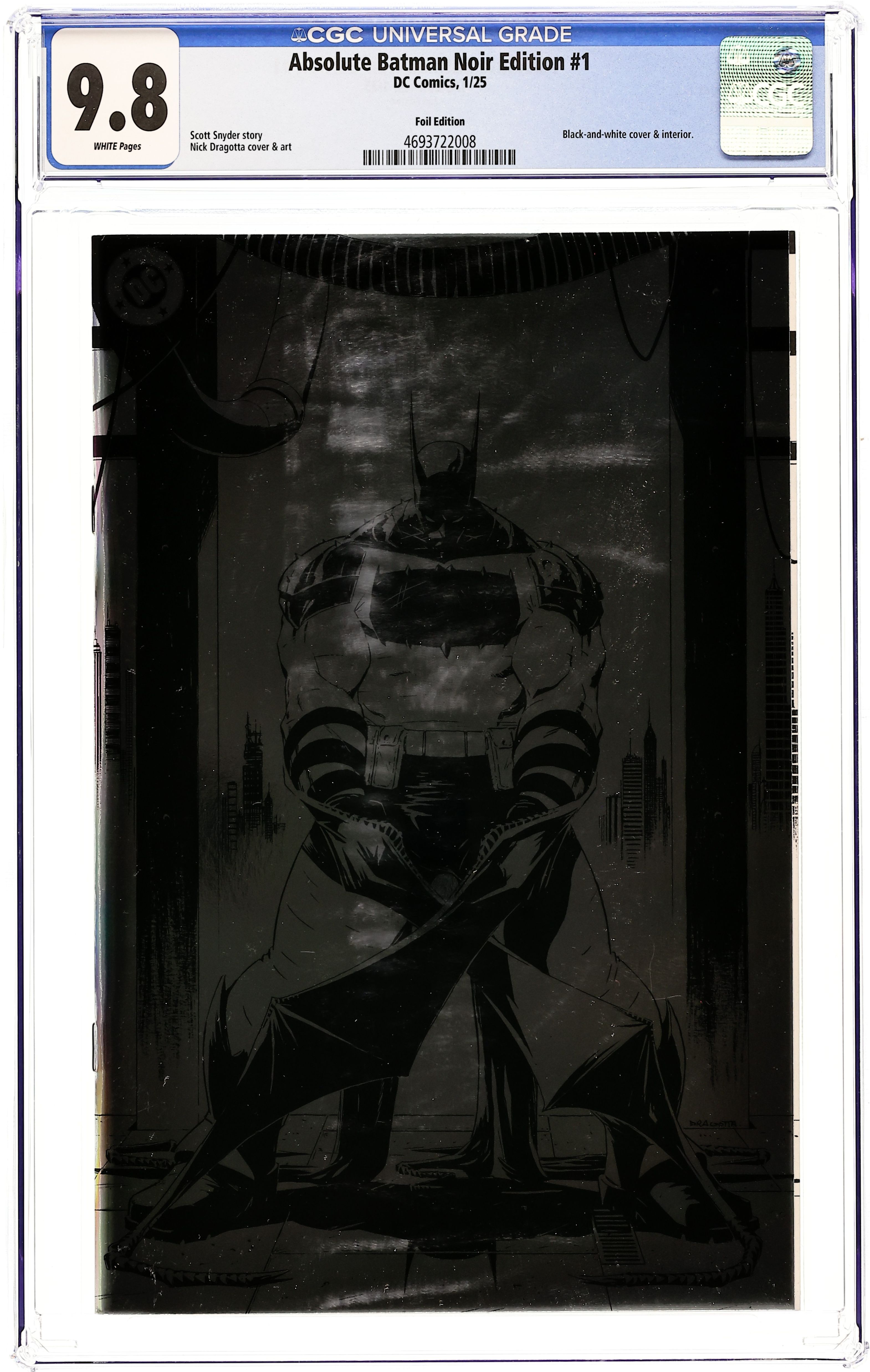 Written by Scott Snyder. Art and Cover by Nick Dragotta. FOIL COVER. BATMAN LEGEND SCOTT SNYDER AND ICONIC ARTIST NICK DRAGOTTA TRANSFORM THE DARK KNIGHT'S TALE FOR THE MODERN AGE! Without the mansion...without the money...without the butler...what's left is the Absolute Dark Knight! 48 pages, full B&W. Rated T+ Cover price $7.99.