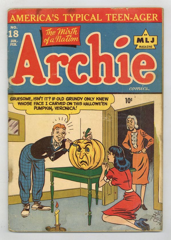 Cover by Al Fagaly. Stories by unknown. Art by Bill Vigoda, Bill Woggon, Bob Montana and Al McLean. Archie catches some frogs for a jumping contest and puts them in a casserole dish. Later, Mrs. Andrews mistakes the dish for food and serves it when Judge Morrow comes to visit in "The Frog Catcher"! Plus: Archie is convinced that his lucky coin works until it causes him bad luck at Pop Tate's in "The Lucky Coin"; a tale starring Dotty and Ditto; Archie and Jughead create a dummy Archie for the murder scene in the school play in "The Dummy"; after a cooking class mishap, Betty and Veronica bake a cake to practice their skills; and while at an assembly to nominate a class president, Betty yells at Archie and Archie is accepted as a nominee in "Negative Psychology"! Also: Archie gets a job at Pop Tate's and accidentally puts castor oil in all of the sodas he sells in the 2-page text story "The Soda "Jerk""! And: Archie activity page "A Minotaur Maze!" 48 pages, full color. Cover price $0.10.