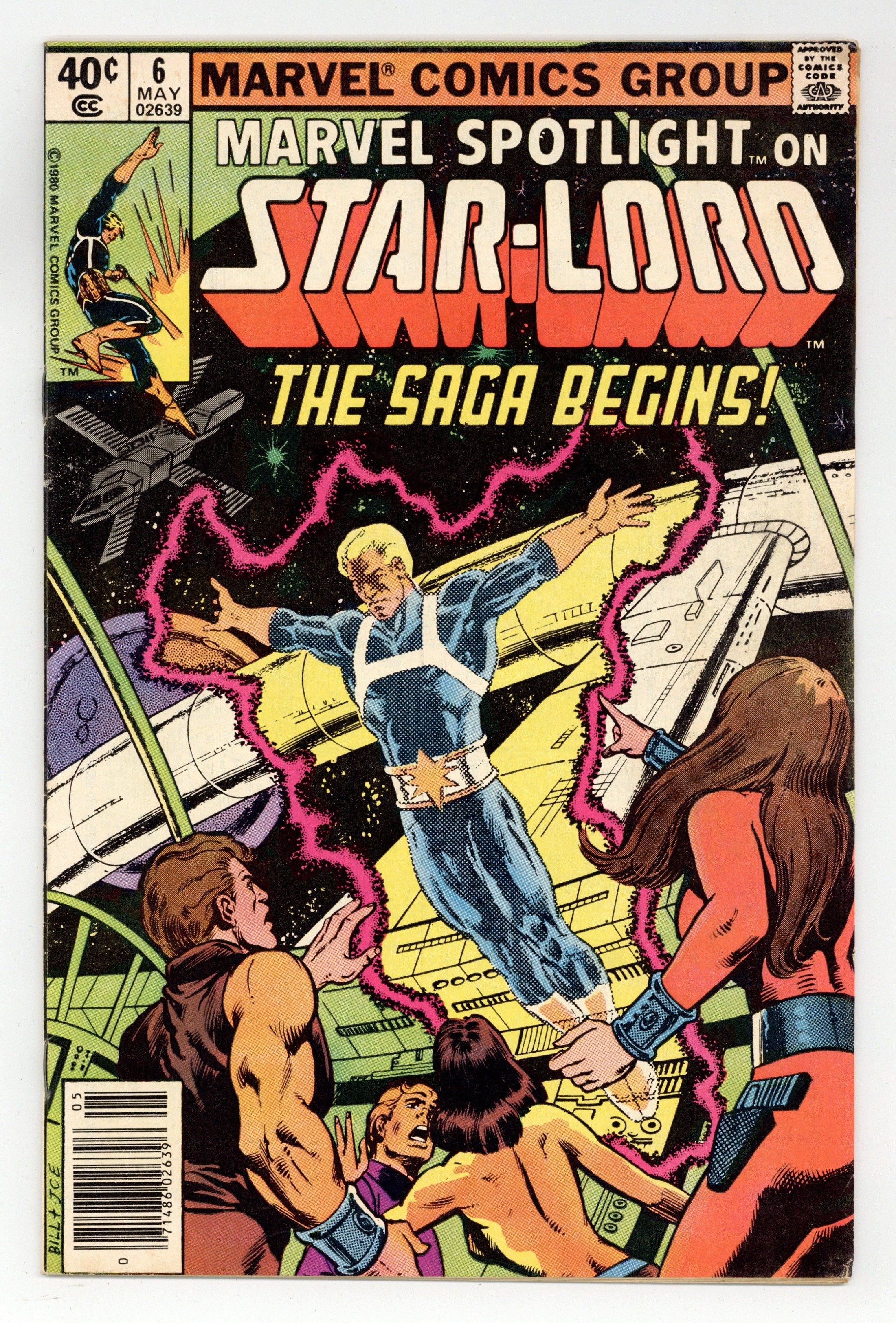 Tags: Anthology / Collection$42.00Newsstand Edition. Marvel Spotlight on Star-Lord - "The Saga of Star-Lord!" Written by Doug Moench. Art by Tom Sutton. Cover by Bill Sienkiewicz and Joe Rubinstein. The saga of Peter Quill, the invincible Star-Lord begins! 32 pages, FC. NOTE: Here's your chance to get caught up on the cosmic adventures of the hero that currently leads the Guardians of the Galaxy. - Odinson, Lone Star Comics Archivist Cover price $0.40.