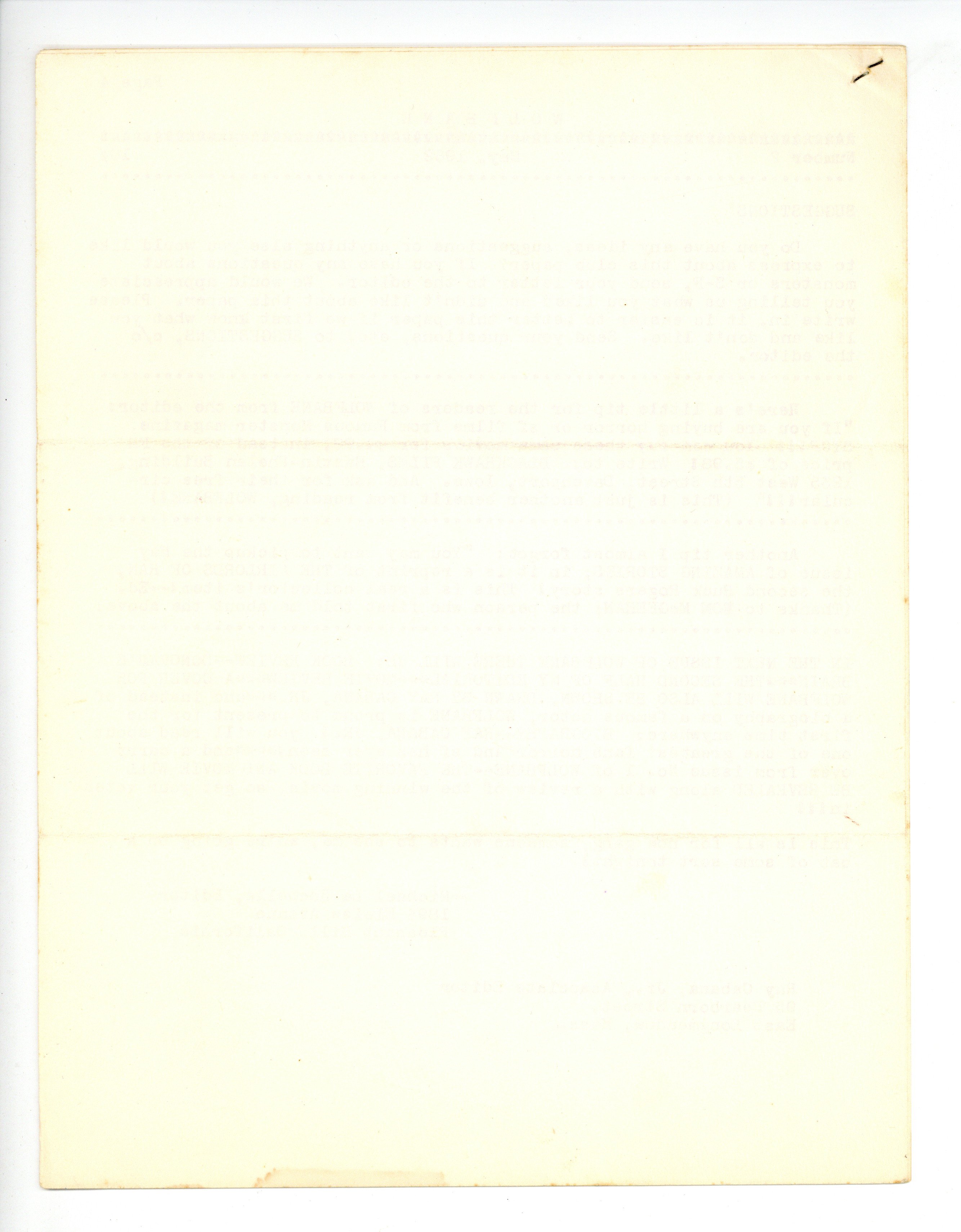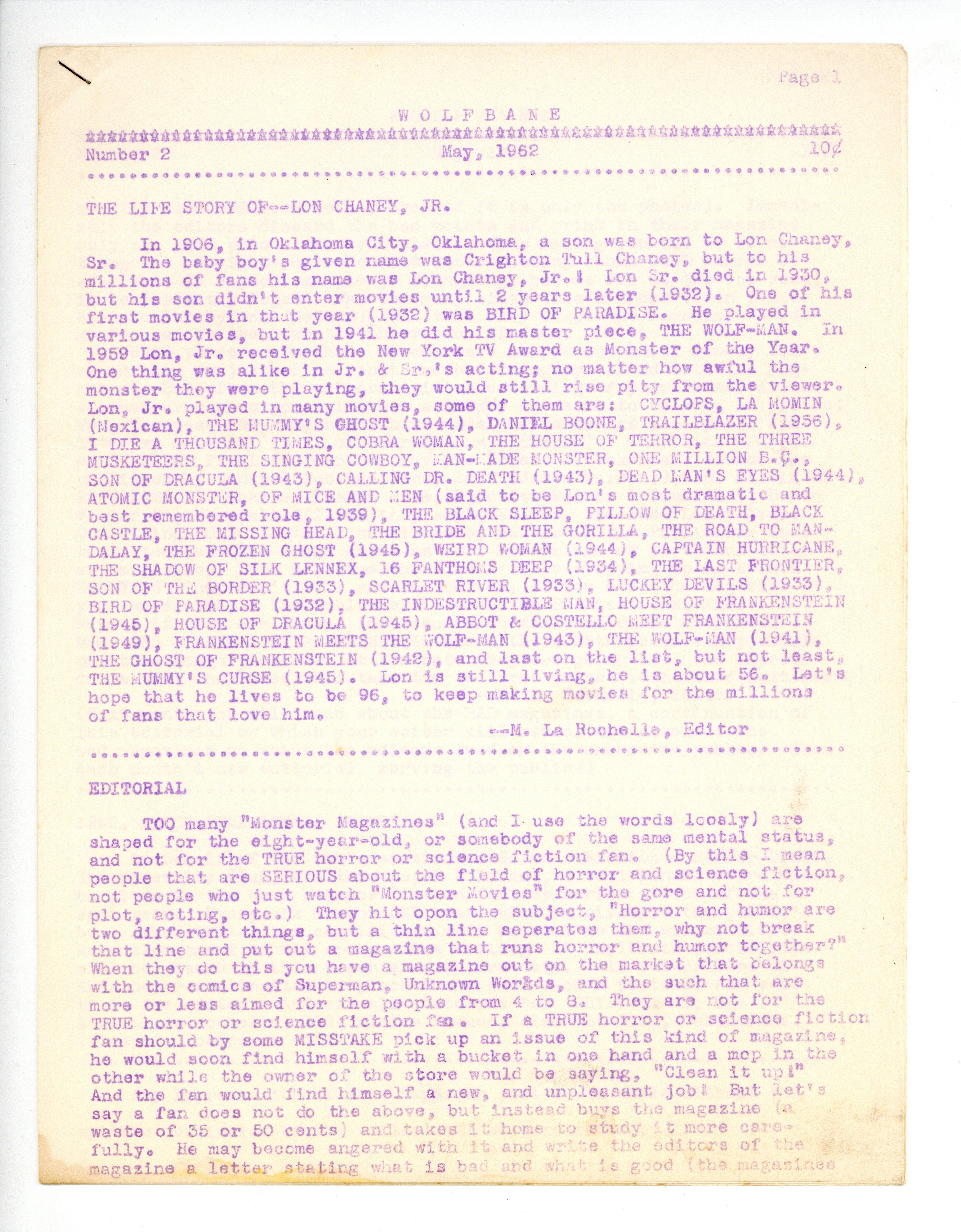 Wolfbane was a horror and science fiction fanzine published and edited by Mike La Rochelle. 8.5" x 11", 4 single-sided sheets, ditto blue printing. Cover price $0.10.
