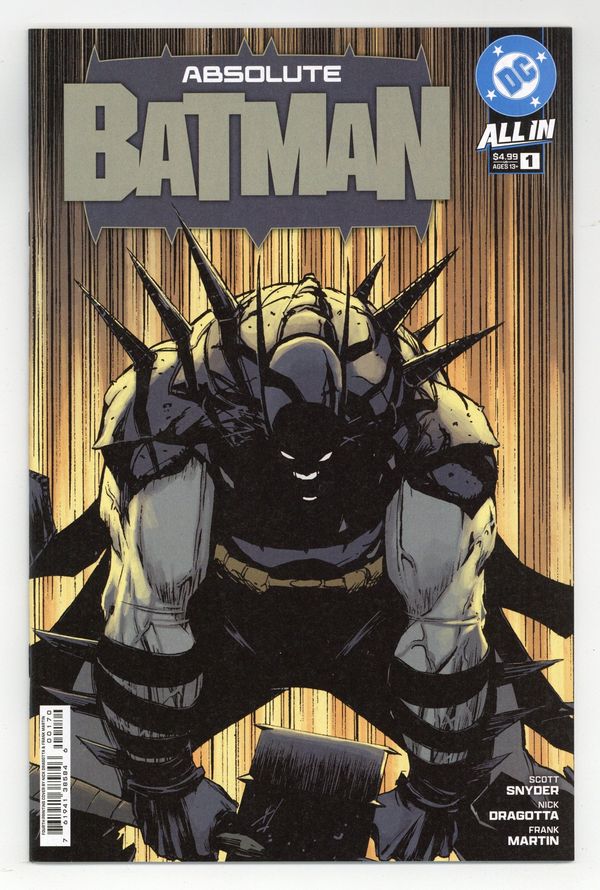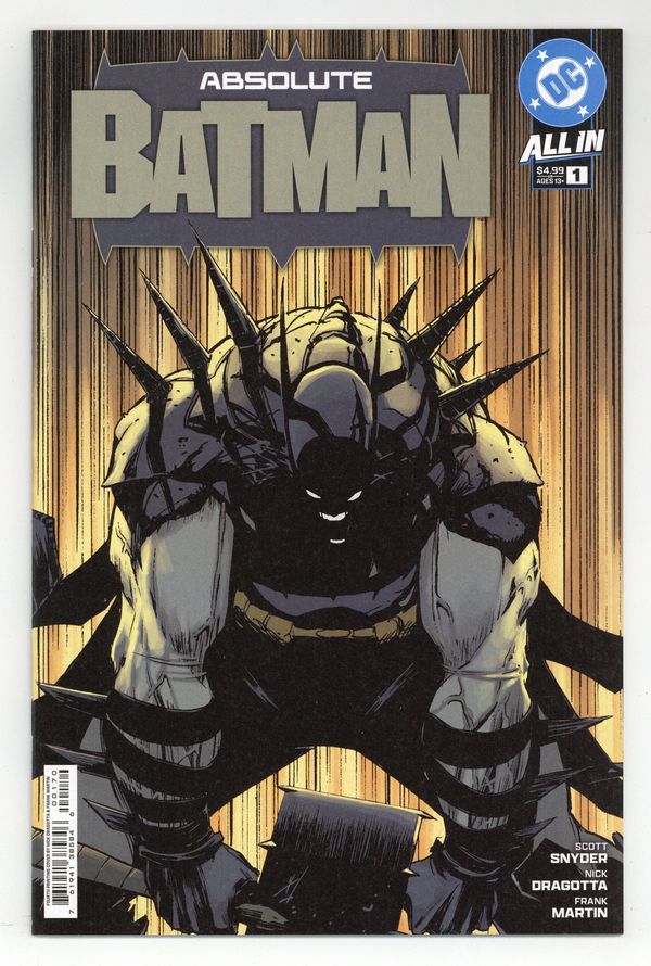 $18.004th Printing. Cvr A. Written by Scott Snyder. Art by Nick Dragotta. Cover by Nick Dragotta. BATMAN LEGEND SCOTT SNYDER AND ICONIC ARTIST NICK DRAGOTTA TRANSFORM THE DARK KNIGHT'S TALE FOR THE MODERN AGE! Without the mansion...without the money...without the butler...what's left is the Absolute Dark Knight! 44 pages, full color. Rated T+ Cover price $4.99.