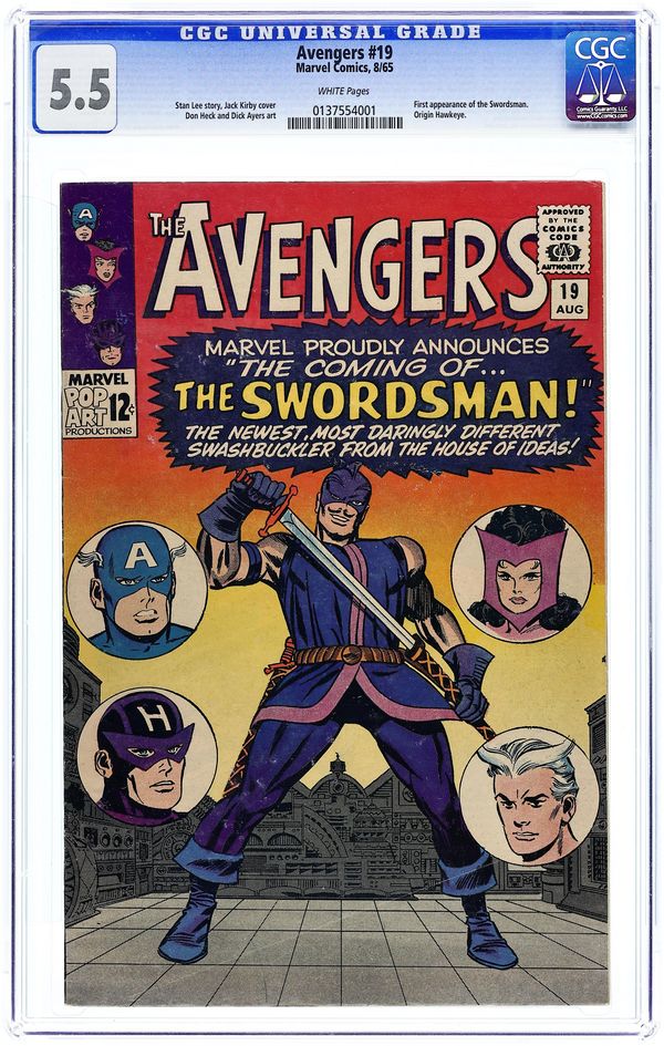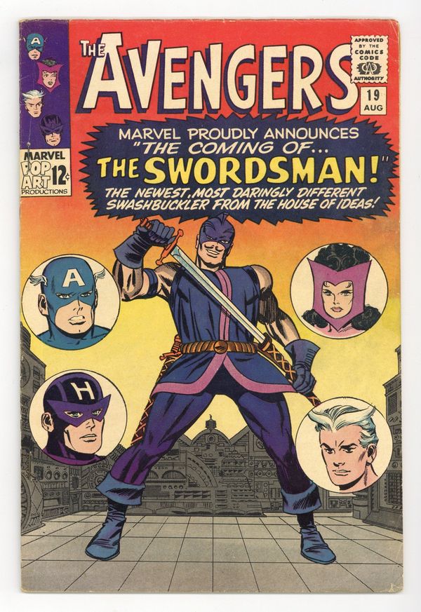 Ends Nov 17 7:35 PM CST Bid History 9 bids Current Bid $19 Your Secret Max Bid If you'd like to bid, please log in or register. Cover pencils by Jack Kirby and Don Heck (insets), inks by Frank Giacoia. First appearance of the Swordsman and the origin of Hawkeye in "The Coming of... the Swordsman!", script by Stan Lee, pencils by Don Heck, inks by Dick Ayers; The Swordsman infiltrates the Avenger's base and Scarlet Witch and Quicksilver attack him; He then admits he was testing them and wants to apply for membership; Captain America intervenes with information saying he is a wanted man and the Swordsman escapes; Hawkeye explains that the Swordsman used to be his tutor when he was in the circus; Meanwhile, in Nick Fury's office in Washington D.C HYDRA agents find a letter from Captain America; They later discard it as trash; It explained how Captain America wanted to work for S.H.I.E.L.D.; A mobster finds it and gives it to the Swordsman; A trap is laid for Captain America; He then leaves to meet with "Nick Fury"; Hawkeye finds out about the plan and gathers the other Avengers to help him; Captain America battles the Swordsman and gets captured before the others can arrive to help. Avengers Roll Call: Captain America, Hawkeye, Quicksilver, and the Scarlet Witch. Letter to the editor from Cary Burkett. 36 pgs., full color. $0.12. Cover price $0.12.
