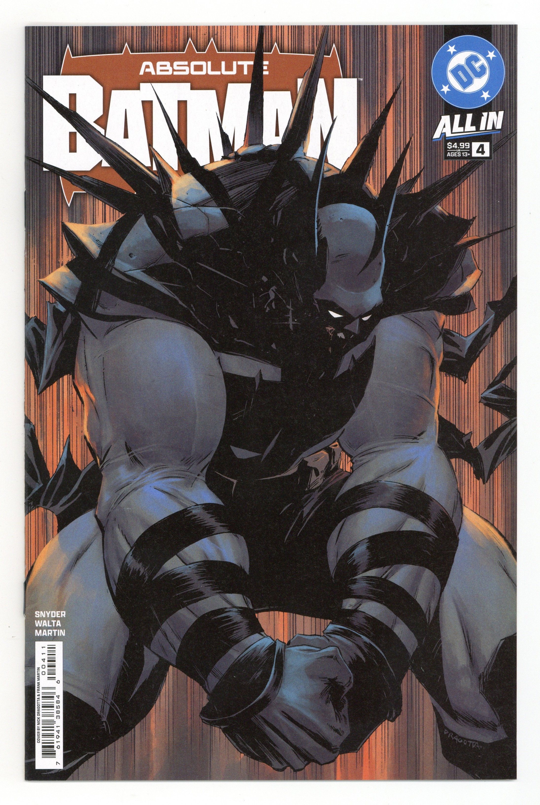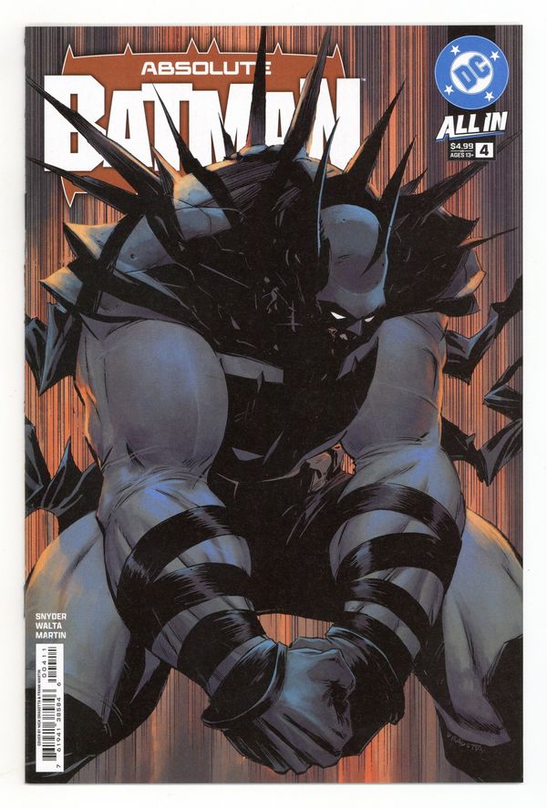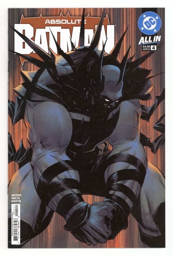 Starts Apr 4 Written by Scott Snyder. Art by Gabriel Walta. Cover by Nick Dragotta. Absolute Batman has established himself as an extremely large force to be reckoned with. But how did he get to this point? How did he push himself? And how did the tragic events of his childhood, and the advice of his father, shape the man who he became...literally? Guest artist Gabriel Walta joins for this essential origin issue of Absolute Batman to explore Bruce Wayne's past, and his inevitable future to go BIGGER. Don't miss this pivotal issue! 28 pages, full color. Rated T+ Cover price $4.99.