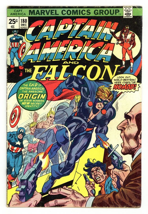 Tags: Marvel Legacy Numbering: Captain America (part 180), Captain America$29.00First appearance of Nomad (aka Steve Rogers) in "The Coming of the Nomad!" Part 1 of 3. Script by Steve Englehart. Pencils by Sal Buscema. Inks by Vince Colletta. Cover by Gil Kane, Mike Esposito, and Frank Giacoia. Thanks to a suggestion from Hawkeye, Steve Rogers decides to become a superhero again. But he wants to adopt a different identity. So, to that end, Steve travels to the Carter estate to design a new costume and pick a new name. Say hello to the Nomad! Meanwhile elsewhere in Virginia, Madame Hydra returns to the terrorist scene after a long absence. Her first act is killing the original Viper, so she can take his name for herself! Then she assumes command of the Serpent Squad to advance her brand of nihilism. Hours later in Washington D.C., the former Captain America and the former Madame Hydra cross paths...and put their new noms de guerre to the test! Nomad vs. the Serpent Squad! What a start for the new hero! First appearance of Hugh Jones. First mention of the Roxxon Oil Corporation. Cameo appearances by the Falcon, Roscoe Simons, Sharon Carter, Harrison Carter, and Warlord Krang. (Notes: Madame Hydra previously appeared in Captain America 113. The cover shows Nomad's color scheme as blue & red; however, it's actually blue & yellow inside. The letters page contains Marvel Value Stamp series A #61 The Red Ghost by Jack Kirby. This issue was reprinted in 2006 in the trade paperback: Captain America and the Falcon Nomad. The TPB collects issues 177 thru 186.) 36 pages. Cover price $0.25.