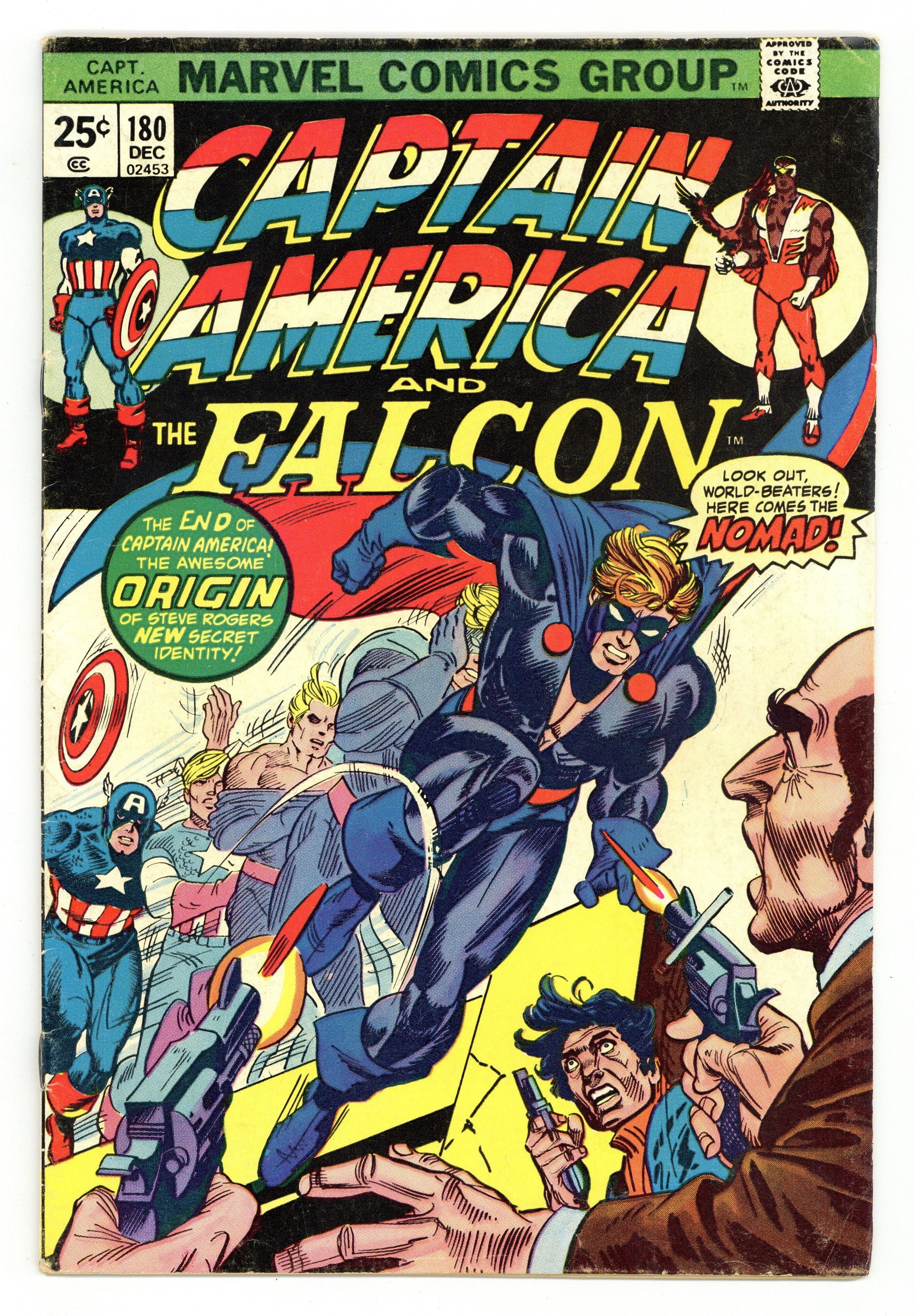 First appearance of Nomad (aka Steve Rogers) in "The Coming of the Nomad!" Part 1 of 3. Script by Steve Englehart. Pencils by Sal Buscema. Inks by Vince Colletta. Cover by Gil Kane, Mike Esposito, and Frank Giacoia. Thanks to a suggestion from Hawkeye, Steve Rogers decides to become a superhero again. But he wants to adopt a different identity. So, to that end, Steve travels to the Carter estate to design a new costume and pick a new name. Say hello to the Nomad! Meanwhile elsewhere in Virginia, Madame Hydra returns to the terrorist scene after a long absence. Her first act is killing the original Viper, so she can take his name for herself! Then she assumes command of the Serpent Squad to advance her brand of nihilism. Hours later in Washington D.C., the former Captain America and the former Madame Hydra cross paths...and put their new noms de guerre to the test! Nomad vs. the Serpent Squad! What a start for the new hero! First appearance of Hugh Jones. First mention of the Roxxon Oil Corporation. Cameo appearances by the Falcon, Roscoe Simons, Sharon Carter, Harrison Carter, and Warlord Krang. (Notes: Madame Hydra previously appeared in Captain America 113. The cover shows Nomad's color scheme as blue & red; however, it's actually blue & yellow inside. The letters page contains Marvel Value Stamp series A #61 The Red Ghost by Jack Kirby. This issue was reprinted in 2006 in the trade paperback: Captain America and the Falcon Nomad. The TPB collects issues 177 thru 186.) 36 pages. Cover price $0.25.
