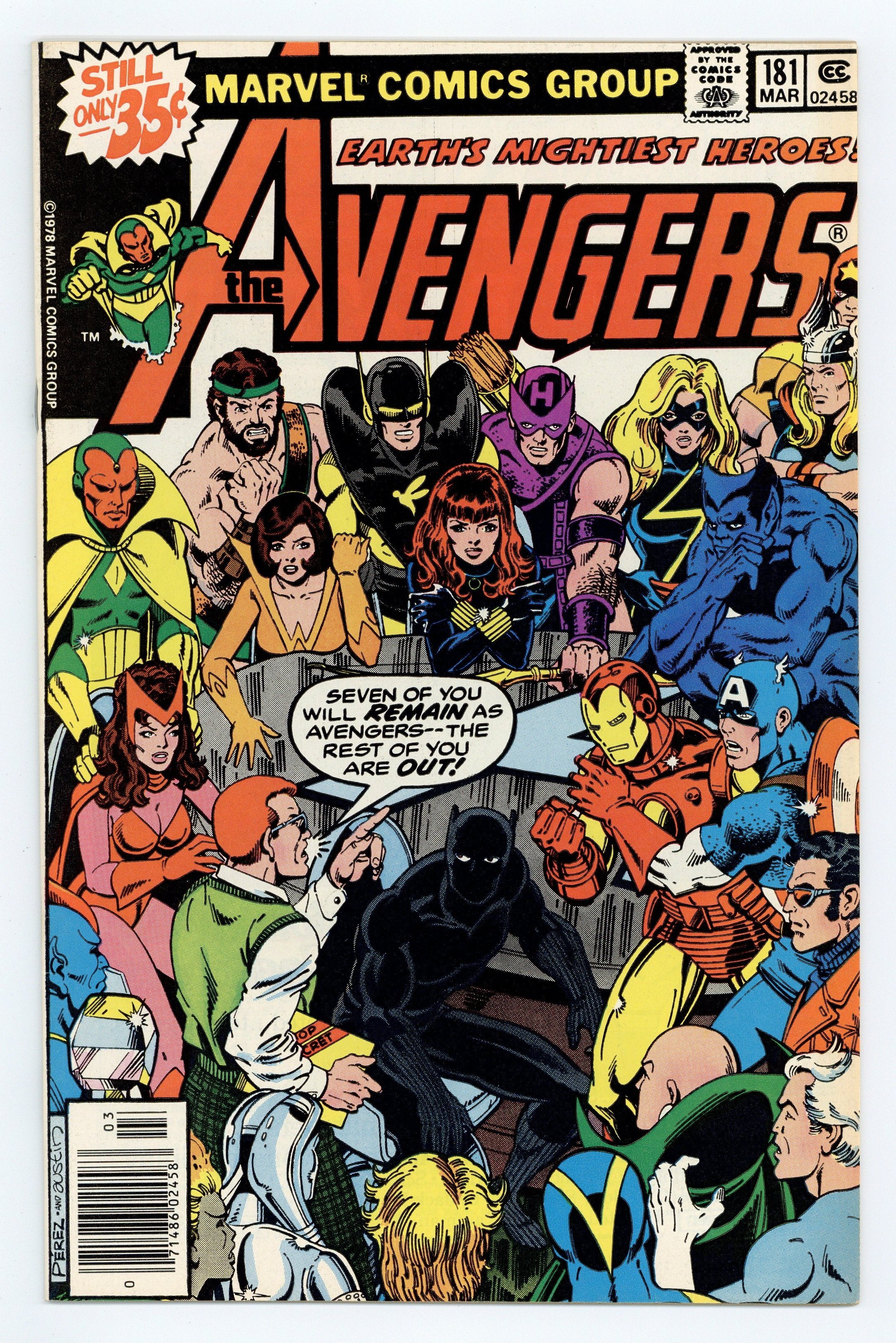 Tags: Marvel Legacy Numbering: Avengers (part 181), Avengers$32.50"On the Matter of Heroes!" Part 1 of 2. Written by David Michelinie. Art by John Byrne (breakdowns) and Gene Day (finishes). Cover by George Perez and Terry Austin. A new era for 'Earth's Mightiest Heroes' begins, and the first order of business is selecting the seven members of the new roster. But this time the federal government is going to help the Avengers choose! Peter Gyrich announces the selections: the Beast, Captain America, Iron Man, Scarlet Witch, Vision, Wasp,...and the Falcon! Hold on, is the Falcon even an avenger? That's what Hawkeye would like to know! Meanwhile, the old man from Vladivostok, Django Maximoff, finally arrives in New York City. And the lives of Pietro and Wanda will never be the same again. Cameo appearances by the Guardians of the Galaxy, Captain Marvel, Ms. Marvel, Black Widow, Hercules, and Moondragon. Note: John Byrne begins his 1-year stint as the regular artist on the series. Note: First appearance of Scott Lang (the second Ant-Man). 36 pgs. Cover price $0.35.