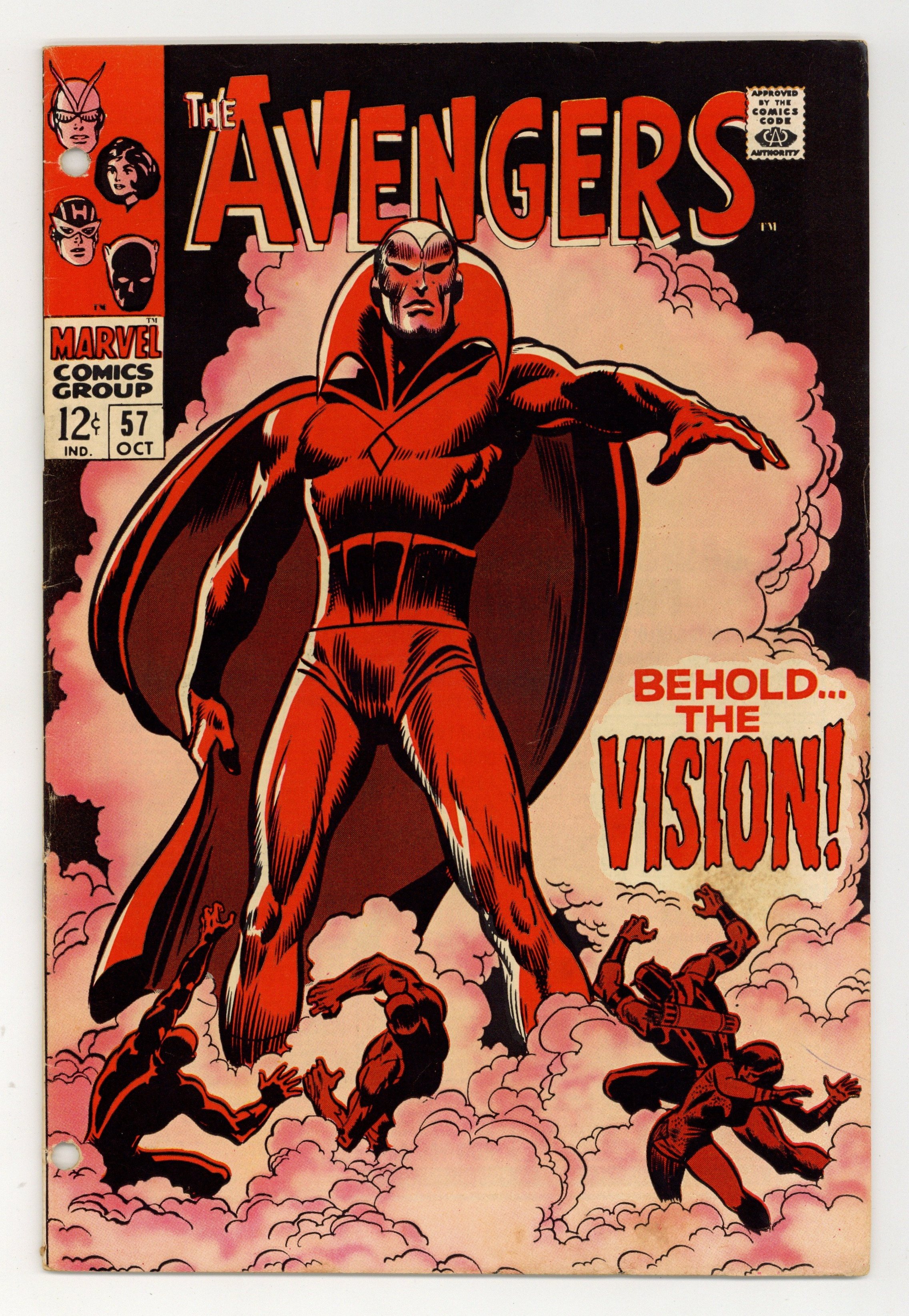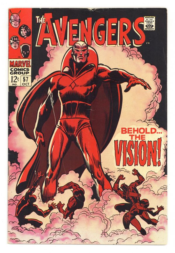 First appearance of the Vision in "Behold...the Vision!" Part 1 of 2. Script by Roy Thomas. Pencils by John Buscema. Inks by George Klein. Cover by John Buscema and George Klein. One of the landmark issues of the silver age! On a rainy night in Manhattan, a strange being enters Janet Van Dyne's apartment and suddenly collapses! The Wasp quickly calls Goliath; and they take the red-hued stranger to Avengers Mansion for examination! Once their Hank Pym discovers that the Vision is a human being constructed of synthetic materials - a synthezoid in fact! When the Vision wakes up, he remembers that Ultron sent him to destroy the Avengers! But now the Vision wants to flip the script on his creator! So he leads Earth's Mightiest Heroes back to Ultron's underground lair! Could this be a trap? Either way Ultron-5 is waiting! And the battle is coming! Will the Vision prove worthy of the Avengers' trust? Cameo appearance by the Black Widow. Avengers Lineup: Black Panther, Goliath, Hawkeye, and the Wasp. (Notes: The synthezoid avenger is not to be confused with the golden age Vision (aka Aarkus). Marie Severin contributed pencils to page 3 - the second to last panel. The letters page includes a letter from comics writer Tony Isabella. This issue was reprinted in Marvel Treasury Edition (1974) #7 and also in Marvel Super Action #18.) 36 pages. Cover price $0.12.