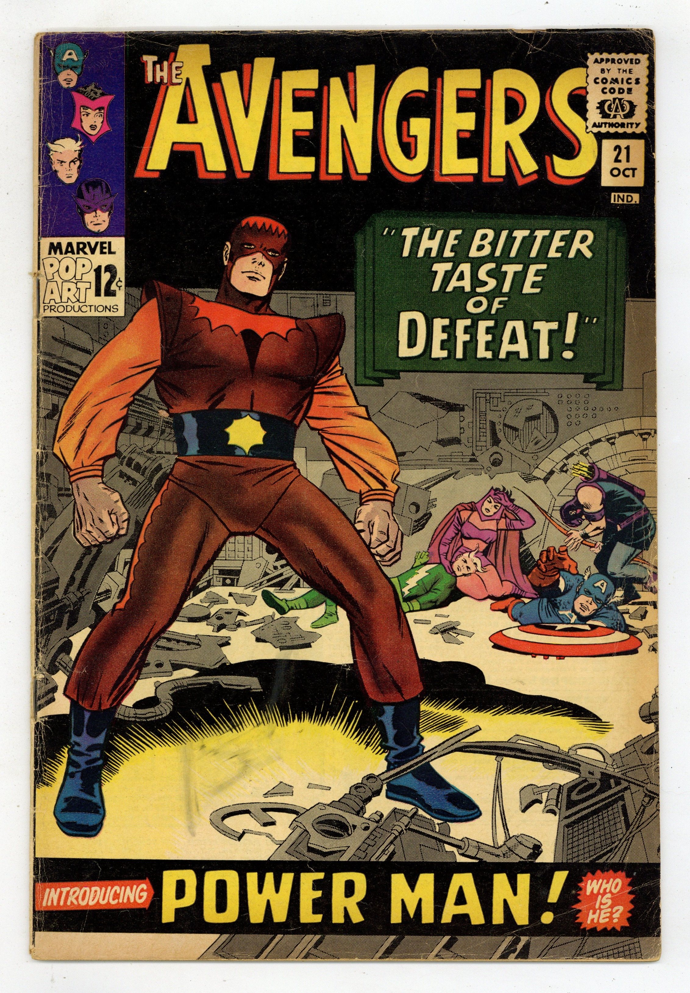 Cover pencils by Jack Kirby, inks by Wally Wood. "The Bitter Taste of Defeat!", script by Stan Lee, pencils by Don Heck, inks by Wally Wood; Enchantress uses the machine that Zemo used to create Wonder Man (see The Avengers #9) to turn one of Zemo's minions into Power Man; The two use tricks--and the Avengers' own internal discord--to make the Avengers appear dysfunctional; The City Council orders them to disband! Avengers Roll Call: Captain America, Hawkeye, Quicksilver, and the Scarlet Witch. Villains: the first Power Man (Erik Josten) and the Enchantress. Guest appearance by Tony Stark (Iron Man). Flashback cameos by the first Baron Zemo, the Executioner, and Wonder Man. Letter to the editor from comics writer Mike Friedrich. Reprinted in Marvel Triple Action #15. 36 pgs., full color. $0.12.