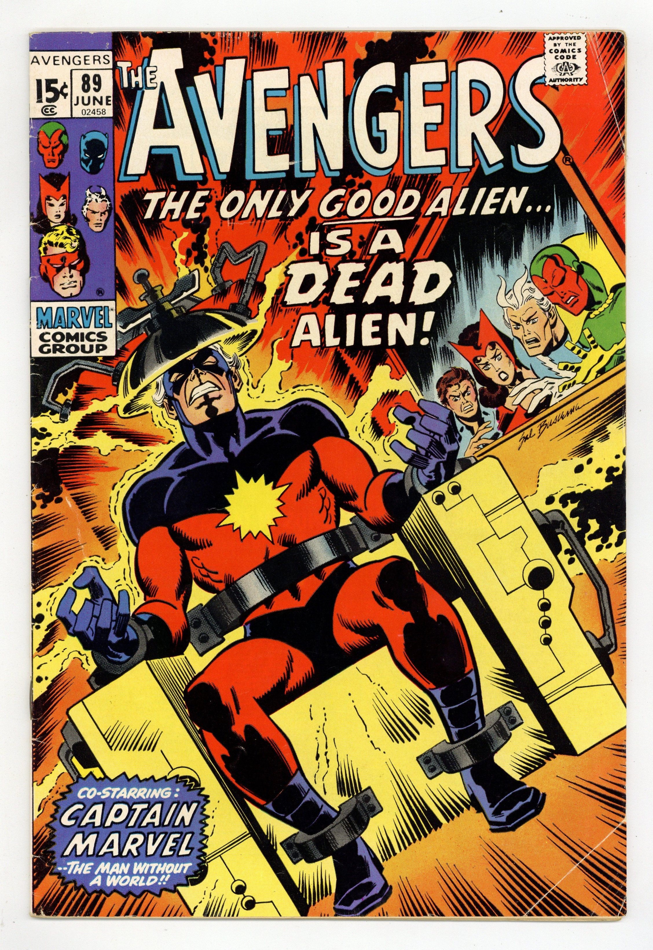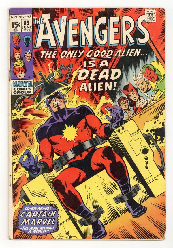 "The Only Good Alien... " Part 1 of 9. Guest-starring Captain Marvel. Script by Roy Thomas. Pencils by Sal Buscema. Inks by Sam Grainger. Cover by Sal Buscema. The classic Kree/Skrull War storyline starts with a bang as Earth's Mightiest Heroes and Rick Jones pursue Captain Marvel on the streets of Miami! Wow, why are the Avengers chasing the Kree Warrior? Especially after Wanda, Pietro, and the Vision just fought alongside him several hours ago in the Baxter Building vs. Annihilus! Dangerously though, the cosmic superhero's body is teeming with deadly radiation after spending too much time in the Negative Zone! Once the Avengers capture Captain Marvel, they take him to Cape Canaveral in hopes of saving his life! Meanwhile on Hala, the Kree homeworld, Ronan the Accuser leads a rebellion against the Supreme Intelligence! Ronan's actions will have immediate and far-reaching effects on the Milky Way Galaxy and of course Earth's Mightiest Heroes! Cameo appearance by Sentry 459. Flashback cameo by Mr. Fantastic to recap his escape from the Negative Zone in Fantastic Four 110. Avengers Lineup: Quicksilver, Scarlet Witch, and the Vision. (Notes: Captain Marvel's participation in the Kree/Skrull War occurs while his own series was on a 2-year hiatus. Ronan previously appeared in Captain Marvel 16. Annihilus appears next in Marvel Team-Up 2. The full Kree/Skrull War saga was reprinted in 2000 in the trade paperback: The Avengers -- The Kree-Skrull War.) 36 pages. Cover price $0.15.