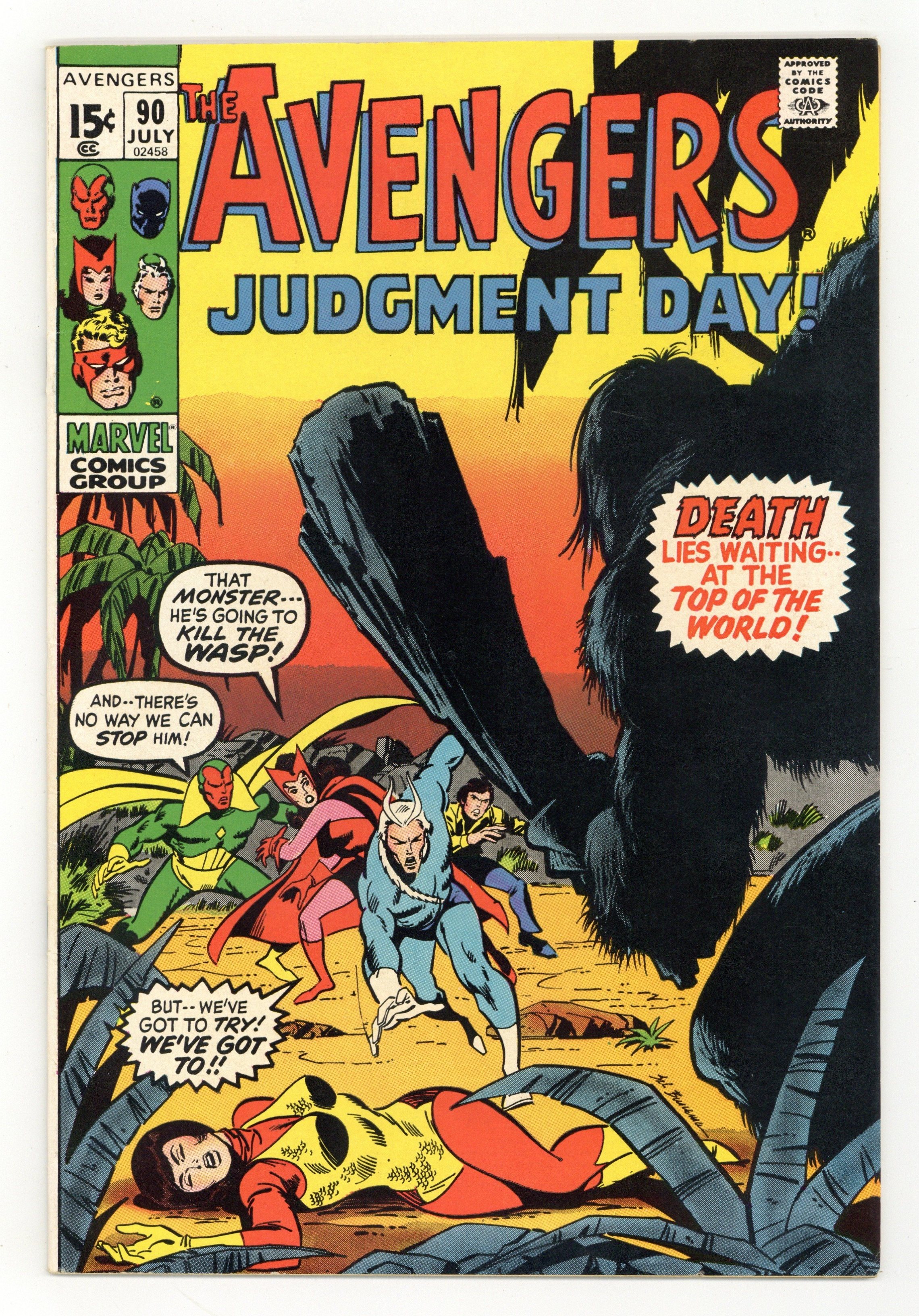 "Judgment Day" Part 2 of 9. Guest-starring Captain Marvel. Script by Roy Thomas. Pencils and Inks by Sal Buscema. Cover by Sal Buscema. Kree Sentry 459 attacks without warning at the Cape! And Quicksilver, the Scarlet Witch, and the Vision are quickly knocked back on their heels! The giant sentry grabs Captain Marvel and then vanishes! Where did the powerful robot go? In the meantime a call for help comes into Avengers Mansion from the Wasp! Something has gone horribly wrong with Yellowjacket's scientific expedition in Alaska! In no time at all, Earth's Mightiest Heroes zoom to the Last Frontier...and discover a jungle on the edge of the Arctic Circle! And guess who else is there: Sentry 459 and Ronan the Accuser! Wow, the master plan of the Kree empire has come to the Land of the Midnight Sun! And the rumble in the jungle Avengers-style is coming next! Cameo appearance by Carol Danvers. Flashback cameos by the Fantastic Four, Super-Skrull, and the Supreme Intelligence. Avengers Lineup: Goliath, Quicksilver, Scarlet Witch, Vision, Yellowjacket, and the Wasp. (Note: Sentry 459 formerly appeared in Captain Marvel (1st series) 1 & 2.) 36 pages. Cover price $0.15.