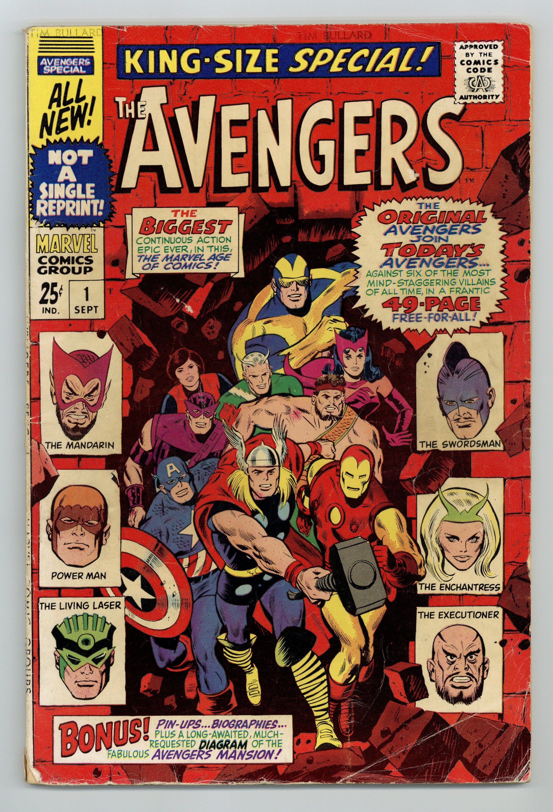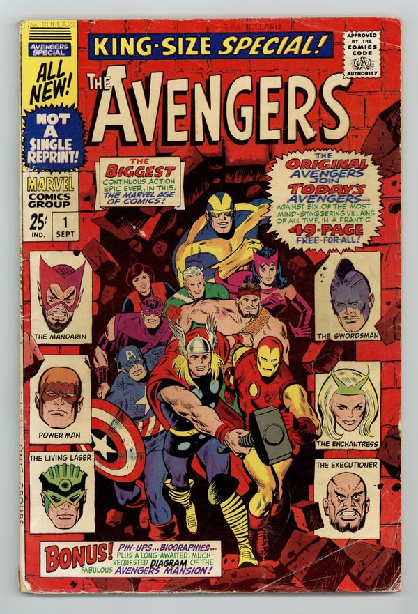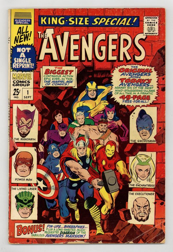 "The Monstrous Master Plan of the Mandarin!" Script by Roy Thomas. Pencils by Don Heck. Inks by George Roussos (as George Bell). Cover by John Buscema and George Roussos (with John Romita touch-ups). The very first Avengers Annual is a blockbuster as the original team of avengers joins with the current team -- to battle six of their greatest foes! The Mandarin returns with a new scheme to conquer the world via a large synthetic diamond. However he needs help to accomplish his goal. So he sends his comrades in arms to three different continents to collect diamonds and wreak havoc! But Earth's Mightiest Heroes stand in their way! In South America Iron Man, Goliath, and the Wasp battle Power Man (aka Erik Josten) and the Swordsman! While in Asia Hercules and the Scarlet Witch clash with the Enchantress and the Executioner! And finally in Africa, Hawkeye and the thunder god face off with the Living Laser! But on the dark continent, the Mandarin has a special surprise waiting: the awesome android called Ultimo! Wow, Thor vs. Ultimo! A battle worth the cover price alone! Eventually, the full contingent of avengers meets the Mandarin inside his orbiting space station for the final showdown! A great annual! Cameo appearances by Jarvis and Nick Fury. Second feature: One-page pin-up of Hercules by Don Heck and George Roussos. Third feature: Two-page diagram of Avengers Mansion. Fourth feature: One-page pin-up of the Black Widow, Scarlet Witch, and Wasp by Don Heck and George Roussos. Fifth feature: One-page pin-up of all the avengers to date. Avengers Lineup: Captain America, Goliath, Hawkeye, Hercules, Iron Man, Quicksilver, Scarlet Witch, Thor, and the Wasp. (Note: This story takes place between Avengers (1st series) #44 and #45.) 68 pages. Cover price $0.25.