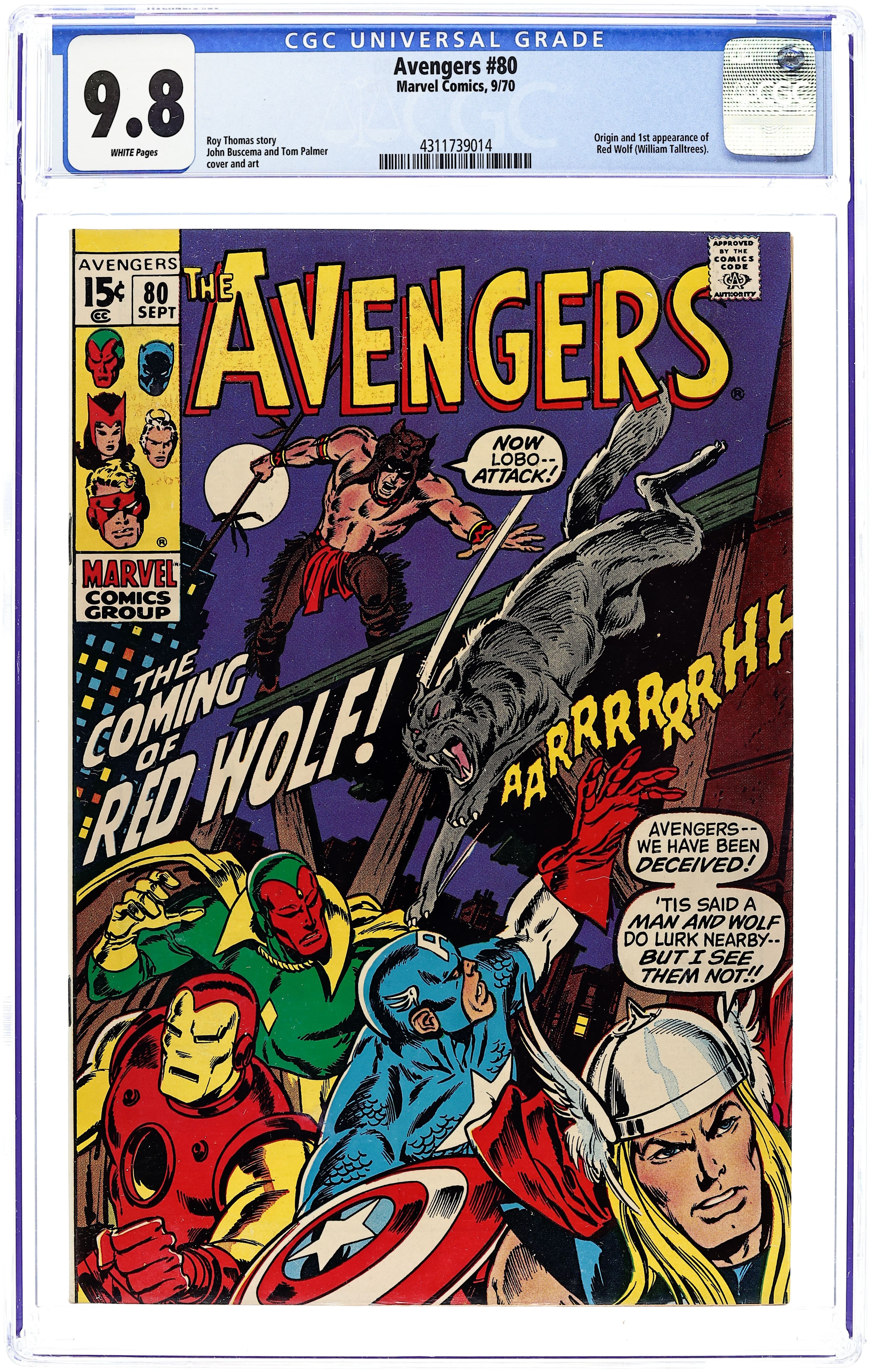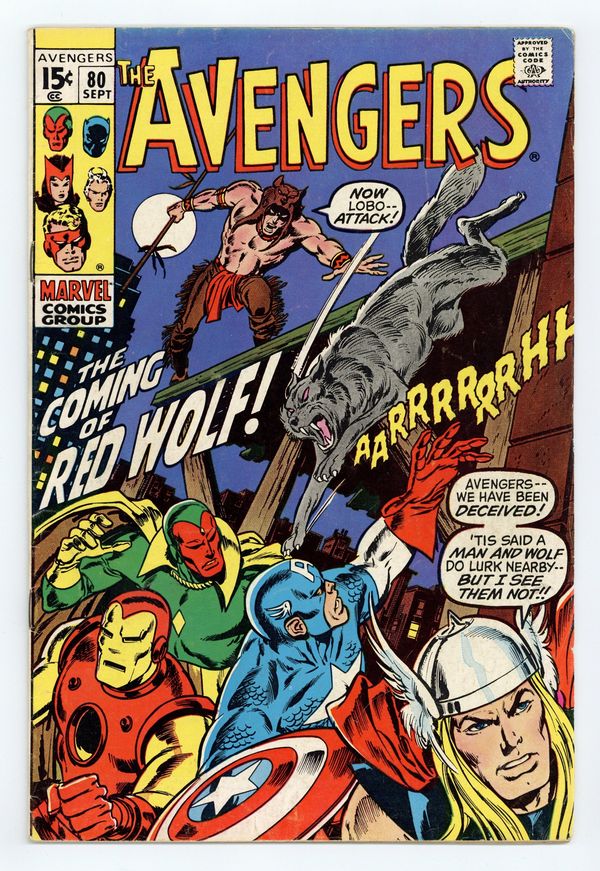 "The Coming of Red Wolf!" Part 1 of 3. First appearance of Red Wolf. Script by Roy Thomas. Pencils by John Buscema. Inks by Tom Palmer. Cover by John Buscema and Tom Palmer. During an evening walk through Manhattan, the Vision encounters a man and a wolf! But this isn't just any human and canine duo, it's the newest Marvel superhero Red Wolf, and his faithful partner Lobo! After a brief skirmish, the synthezoid avenger takes Red Wolf to Avengers Mansion to learn why the native American warrior has traveled so far from home. And regrettably the reason is a name Earth's Mightiest Heroes know very well: Cornelius Van Lunt! The ruthless businessman is using extortion to take land from Red Wolf's tribe! So the Avengers will be departing for big sky country very soon, right? Not so fast! Because the golden avenger has identified an urgent threat in the city: the resurgent Zodiac! Will the Avengers divide and conquer both menaces? Origin of Red Wolf. Avengers Lineup: Black Panther, Captain America, Goliath, Iron Man, Quicksilver, Scarlet Witch, Thor, and the Vision. (Note: The letters page includes a full-page reply by Roy Thomas to a controversial fan letter (printed in Avengers 79) about the story in Avengers 73 & 74.) 36 pages. Cover price $0.15.