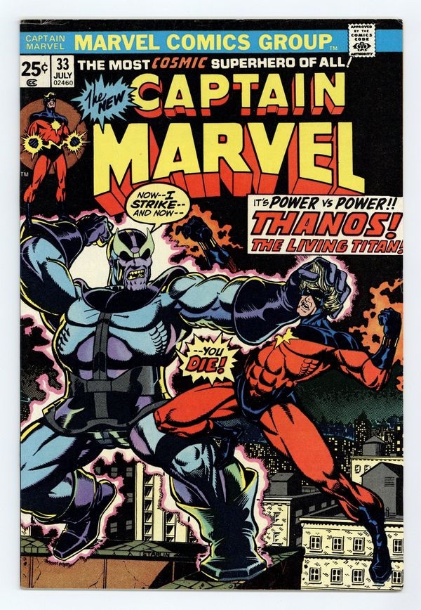 Tags: Thanos: The Final Threat (part 15), Thanos$23.50Captain Marvel battles Thanos in "The God Himself!" Script by Steve Englehart, plot and pencils by Jim Starlin, inks by Klaus Janson. Guest starring Drax the Destroyer. Brief appearance by the Avengers (Thor, Iron Man, the Vision, the Swordsman, Captain America, the Black Panther, and the Scarlet Witch). The letters page contains Marvel Value Stamp series A # 6 (Thor by John Buscema). Starlin cover. Cover price $0.25.