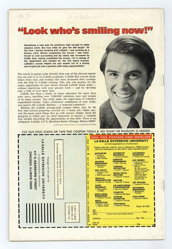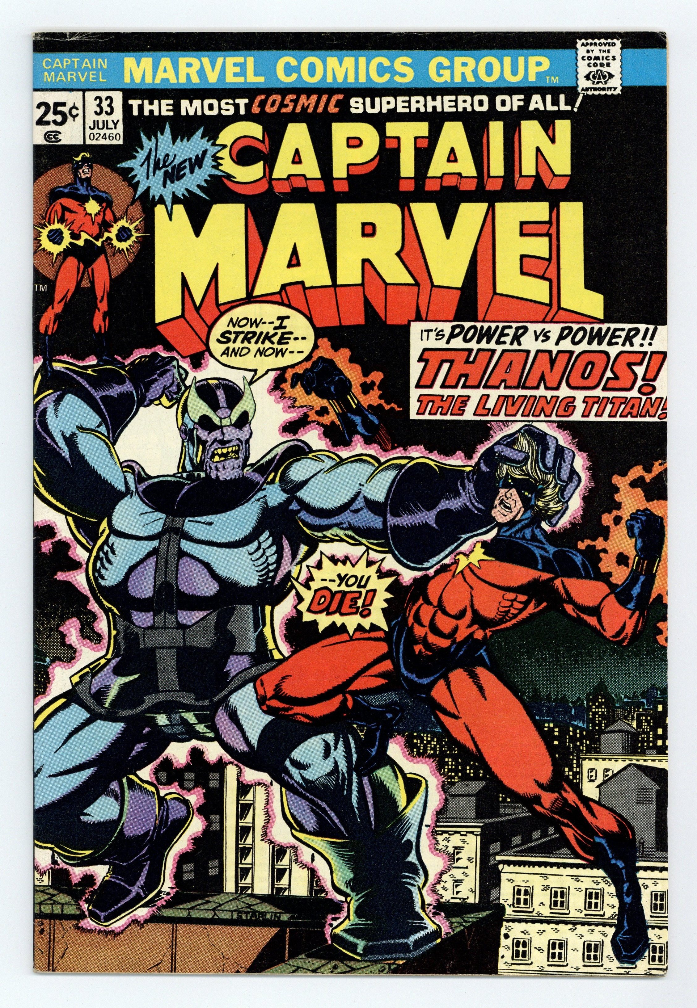 Captain Marvel battles Thanos in "The God Himself!" Script by Steve Englehart, plot and pencils by Jim Starlin, inks by Klaus Janson. Guest starring Drax the Destroyer. Brief appearance by the Avengers (Thor, Iron Man, the Vision, the Swordsman, Captain America, the Black Panther, and the Scarlet Witch). The letters page contains Marvel Value Stamp series A # 6 (Thor by John Buscema). Starlin cover. Cover price $0.25.