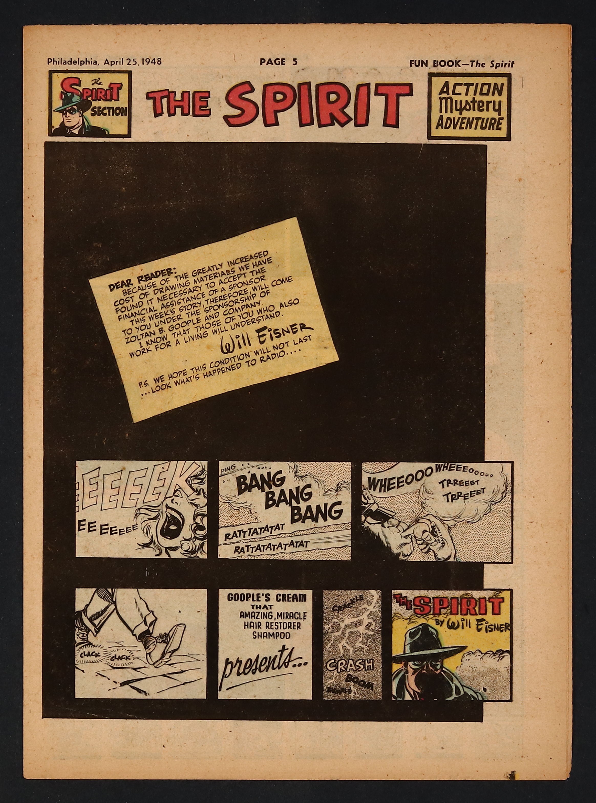 April 25, 1948. Spirit Weekly Newspaper section. Scripts, pencils/inks by Eisner except where noted. Tabloid Sized Newsprint, 10-3/4" x 15", 8 pages, full color.