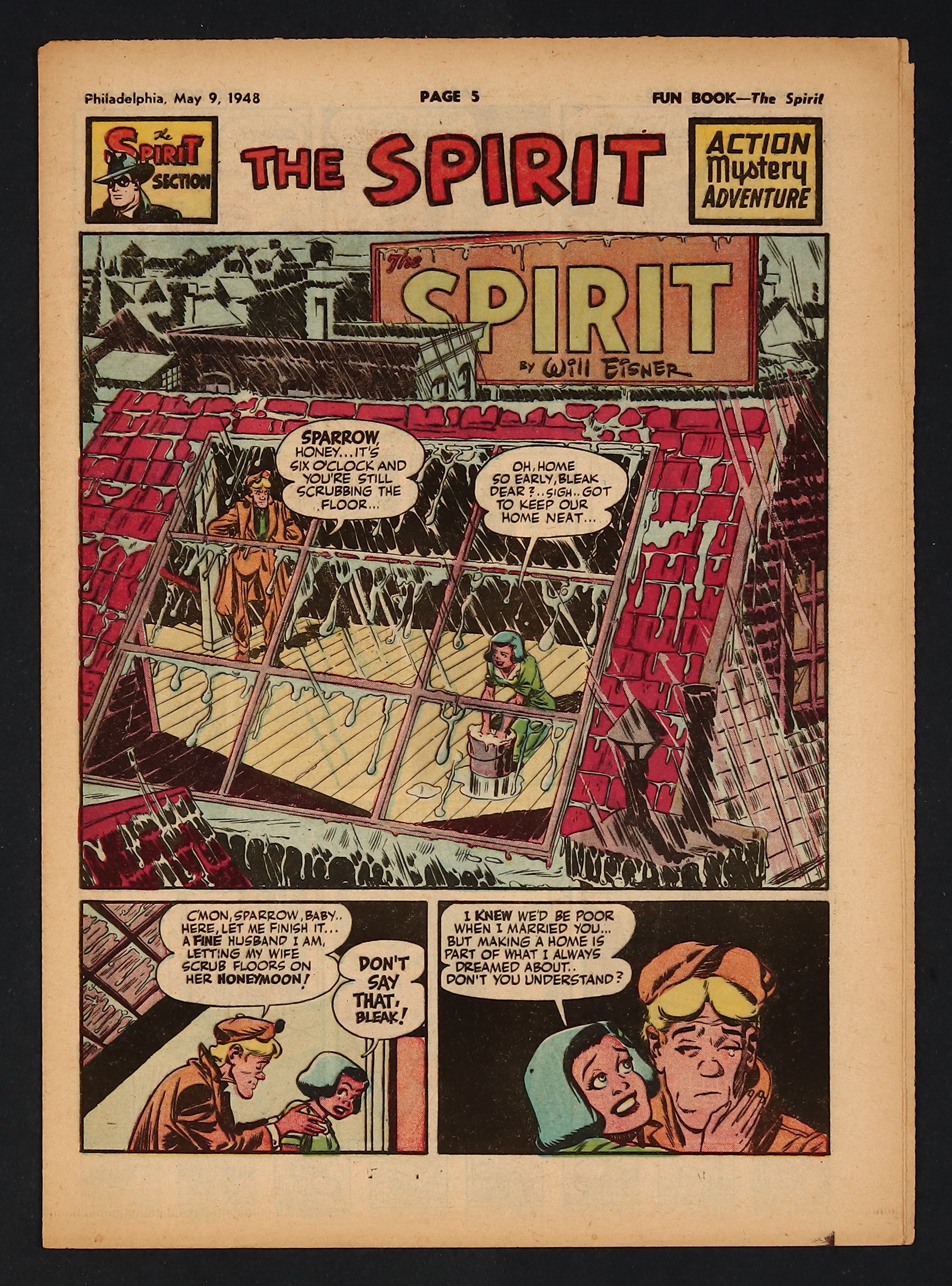 May 9, 1948. Spirit Weekly Newspaper section. Scripts, pencils/inks by Eisner except where noted. Tabloid Sized Newsprint, 10-3/4" x 15", 8 pages, full color.