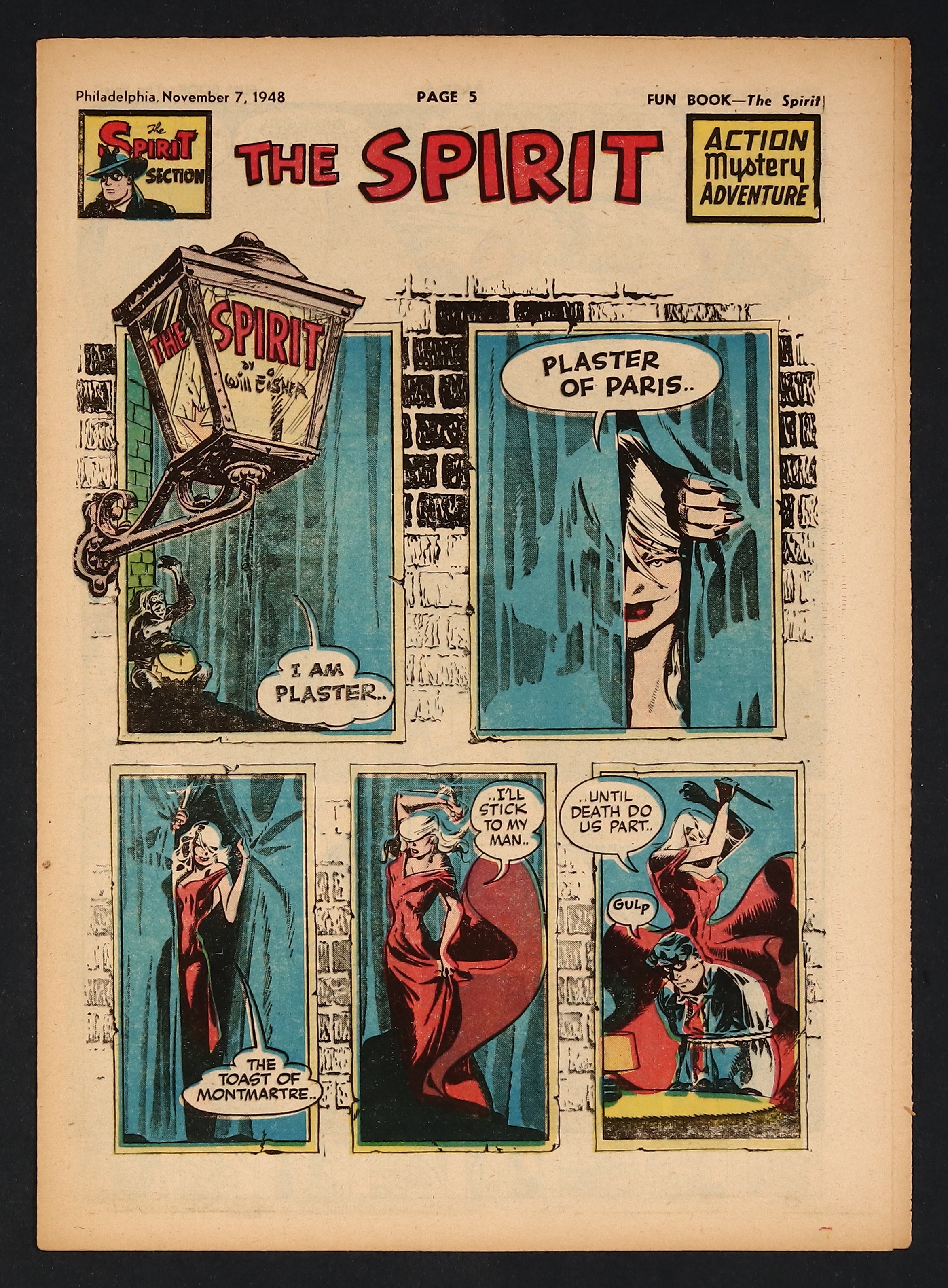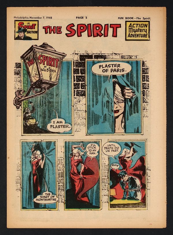 November 7, 1948. Spirit Weekly Newspaper section. Scripts, pencils/inks by Eisner except where noted. Only appearance of Plaster of Paris. Tabloid Sized Newsprint, 10-3/4" x 15", 8 pages, full color.