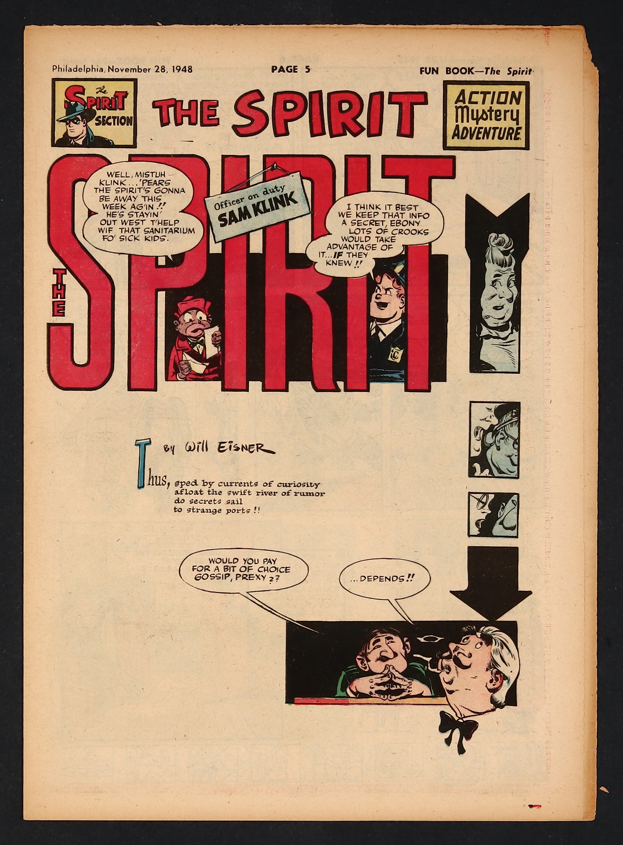 November 28, 1948. Spirit Weekly Newspaper section. Scripts, pencils/inks by Eisner except where noted. Tabloid Sized Newsprint, 10-3/4" x 15", 8 pages, full color.