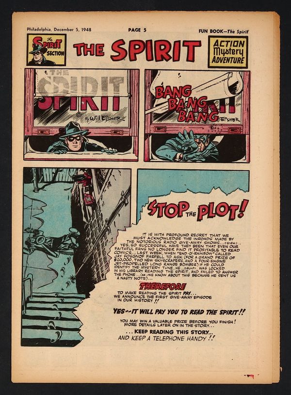 December 5, 1948. Spirit Weekly Newspaper section. Scripts, pencils/inks by Eisner except where noted. Tabloid Sized Newsprint, 10-3/4" x 15", 8 pages, full color.