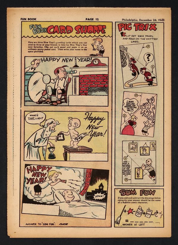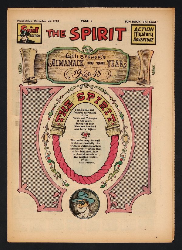 December 26, 1948. Spirit Weekly Newspaper section.Scripts by Eisner or Feiffer, or Eisner/Feiffer, or Nordling. Art by Eisner with backgrounds by Eisner, Grandenetti, Le Blanc, Stallman, Nordling, Dixon and/or others except where noted. Reprints some covers of 1948 with flashbacks.. Tabloid Sized Newsprint, 10-3/4" x 15", 8 pages, full color.