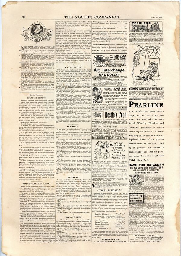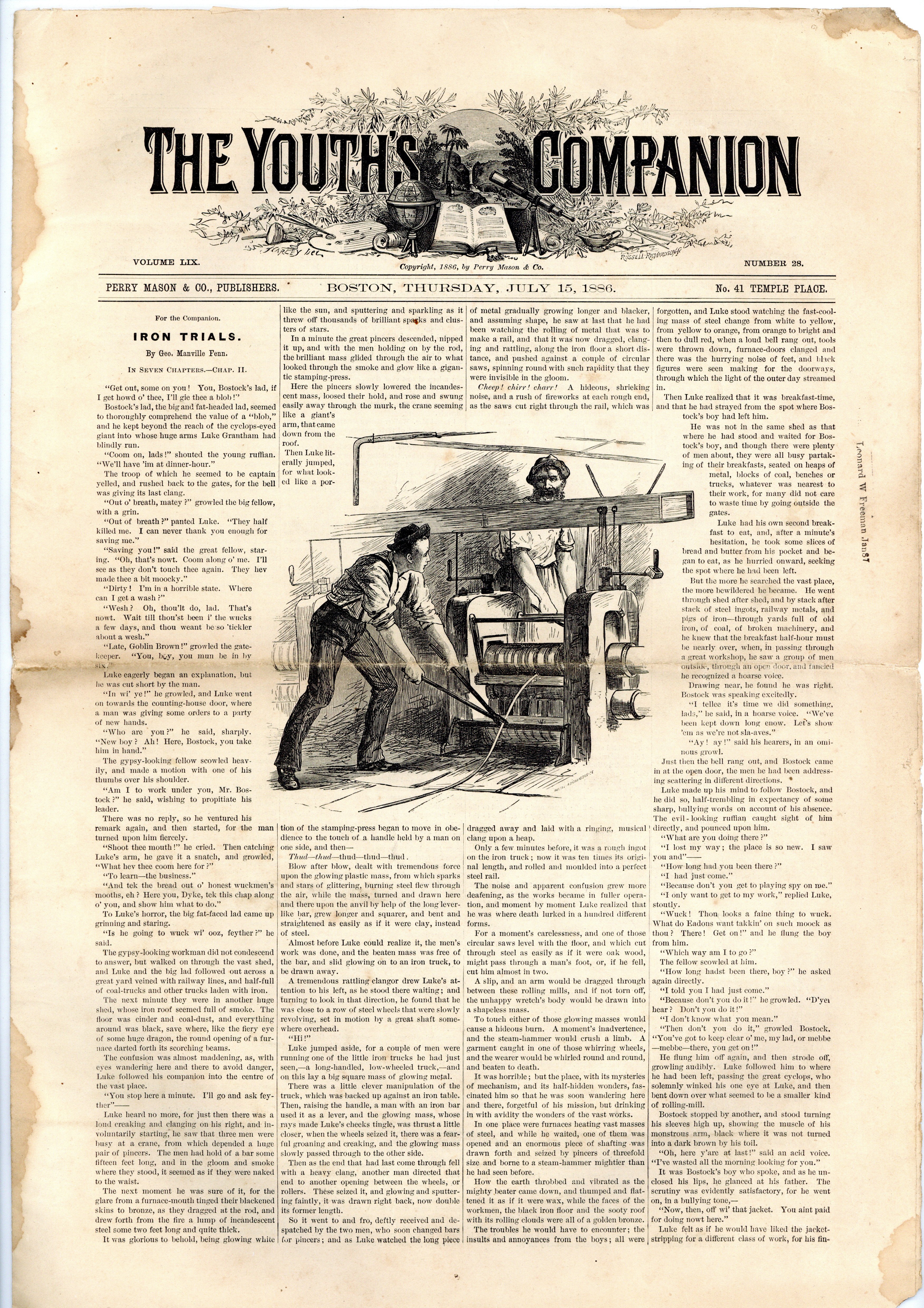 Vol. 59, No. 28 - July 15, 1886. Children's magazine with multi-part stories, news, and poems. 11.25" x 16.5". 12 pages. Black and white. Cover price $0.05.