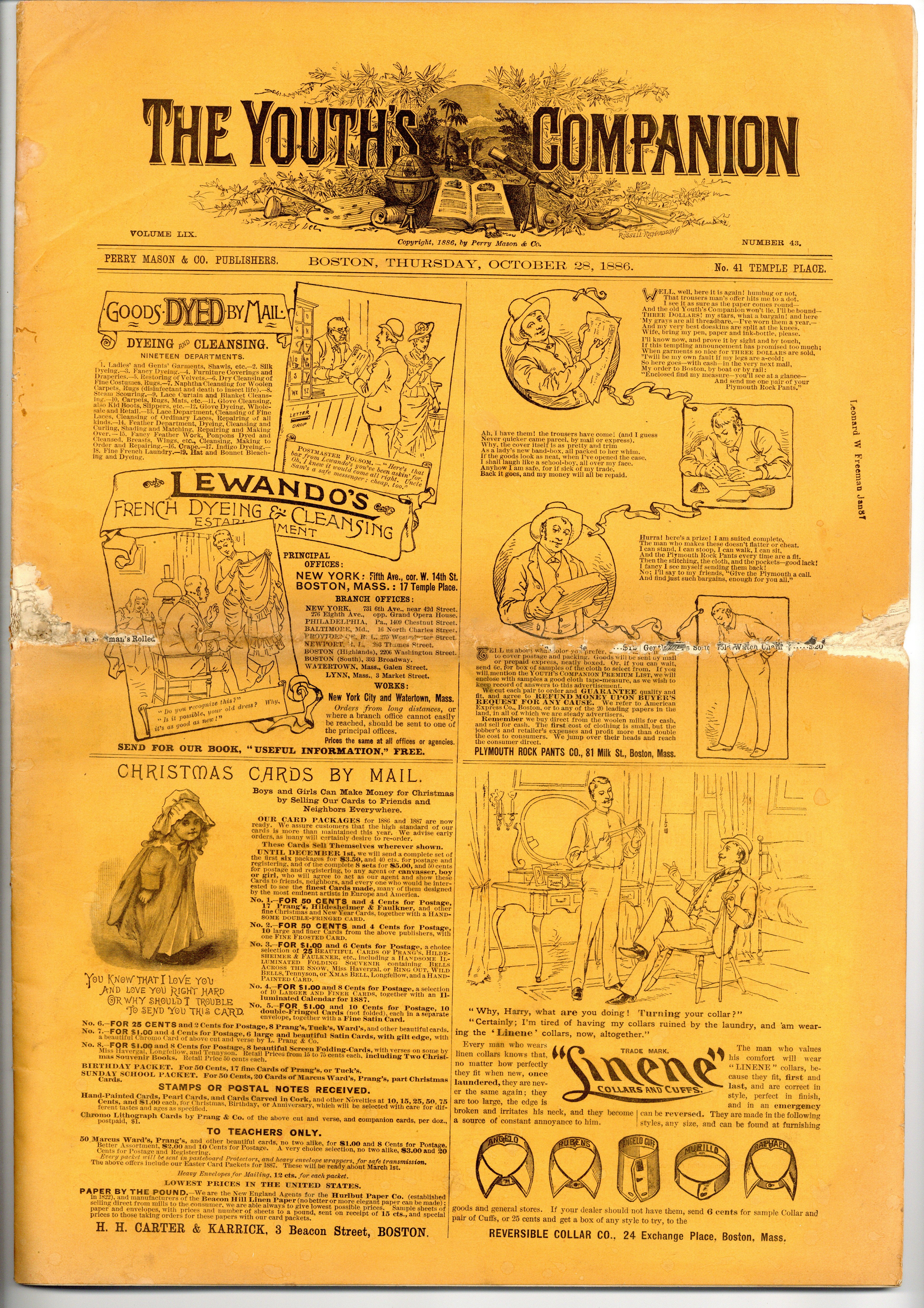 Vol. 59, No. 43 - October 28, 1886. Children's magazine with multi-part stories, news, and poems. 11.25" x 16.5". 30 pages. Black and white. Cover price $0.05.