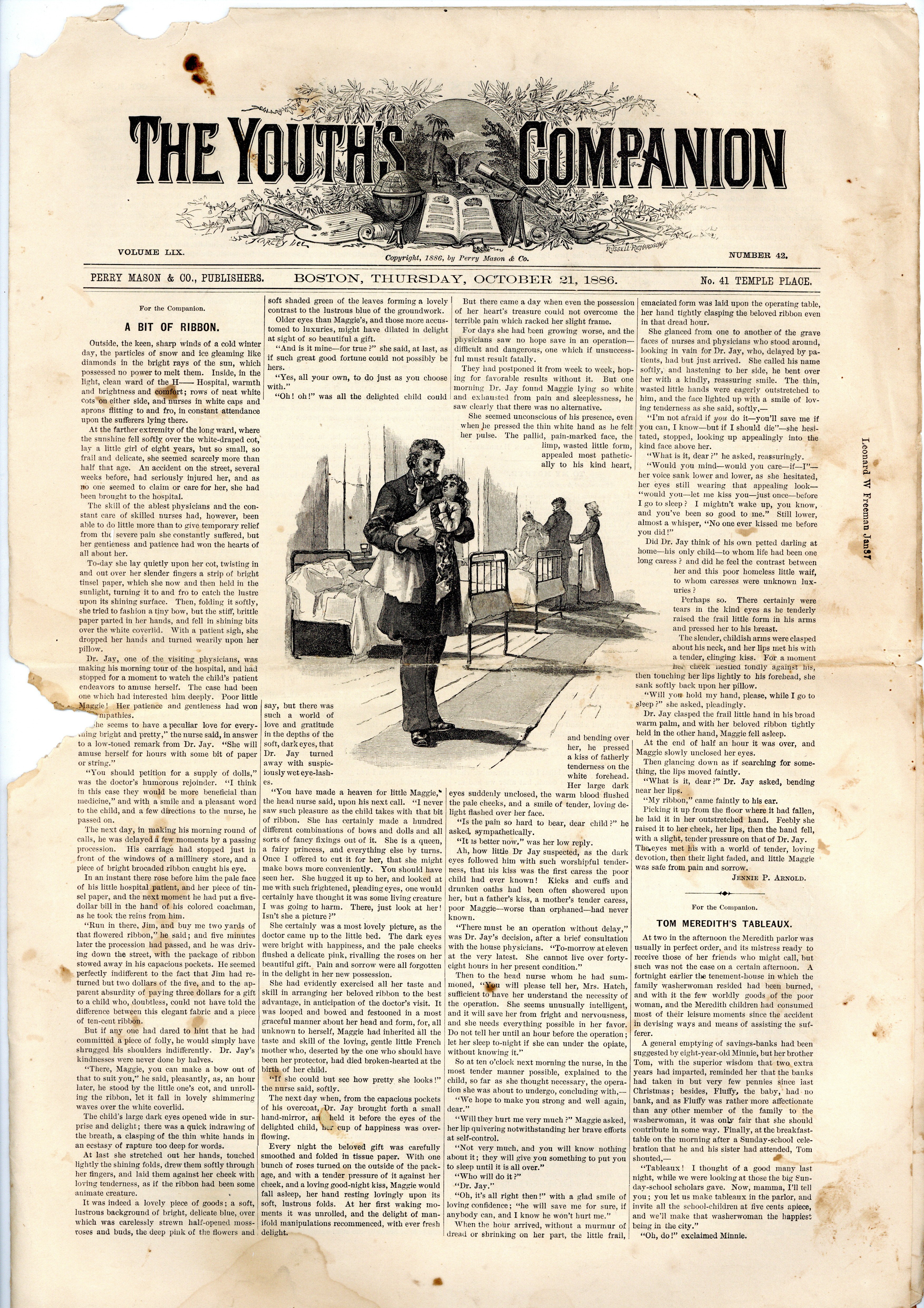 Vol. 59, No. 42 - October 21, 1886. Children's magazine with multi-part stories, news, and poems. 11.25" x 16.5". 12 pages. Black and white. Cover price $0.05.