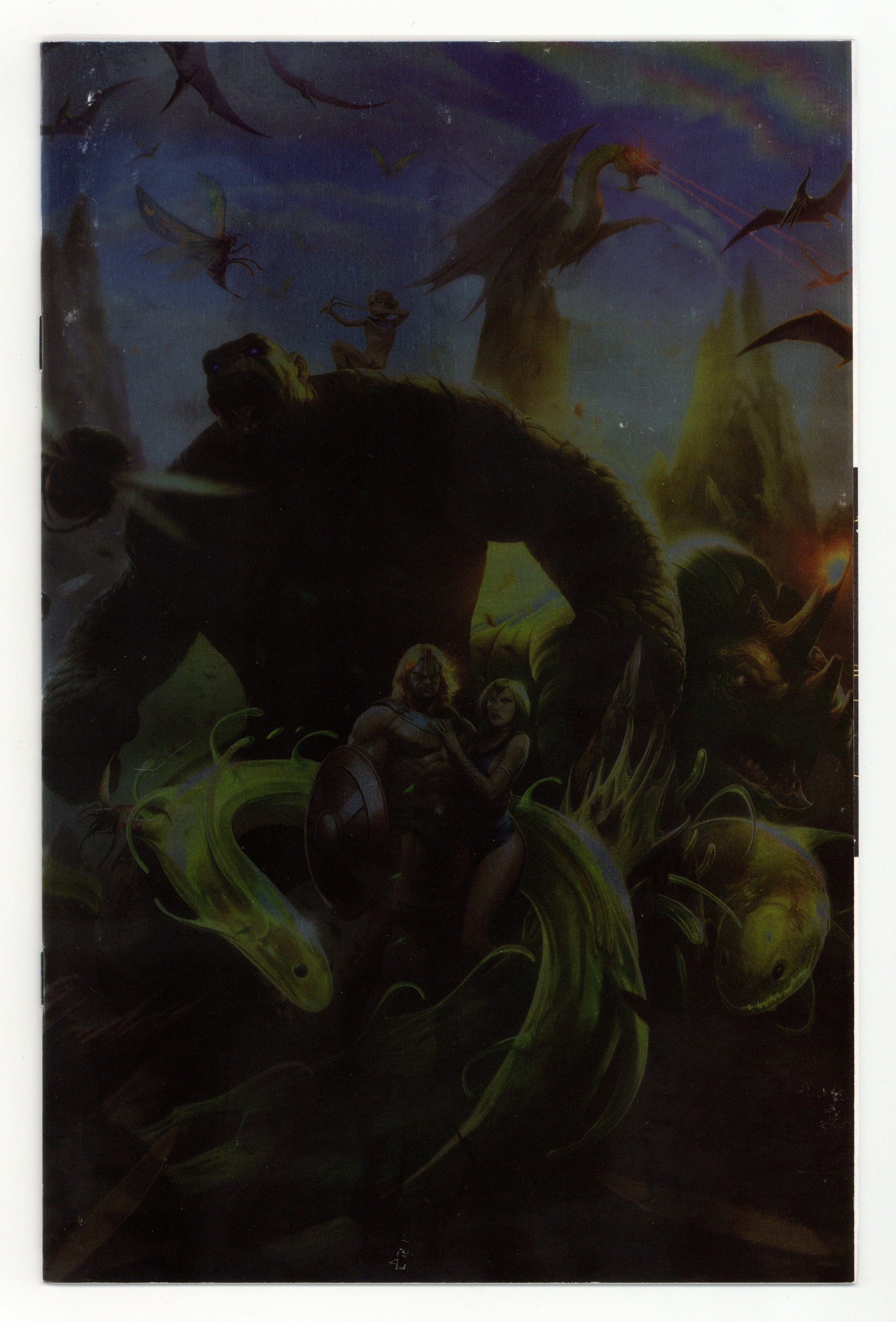 Published 2025 (est.) by Dynamite Entertainment.$23.99Foil Cover. Written by Tom Sniegoski. Art by Craig Rousseau. Cover by Francesco Mattina. Hidden in the furthest reaches of space, the planet of Amzot is legendary for its fabled riches - and for the terrible fates that befall anybody who seeks to exploit them… Those who survive their encounters tell blood-chilling tales of horrific, imposing monsters that guard the mysterious world - yet the lure of its abundant resources is too great to resist. Raiders and pirates continue to come from across the galaxy, and there is only one force strong enough to stop their constant attacks - The Herculoids! But as strong as these defenders are, a recent battle may have pushed Amzot to its limits - and awakened a sleeping darkness within the planet itself! 32 pages, full color. Rated T Cover price $29.99.