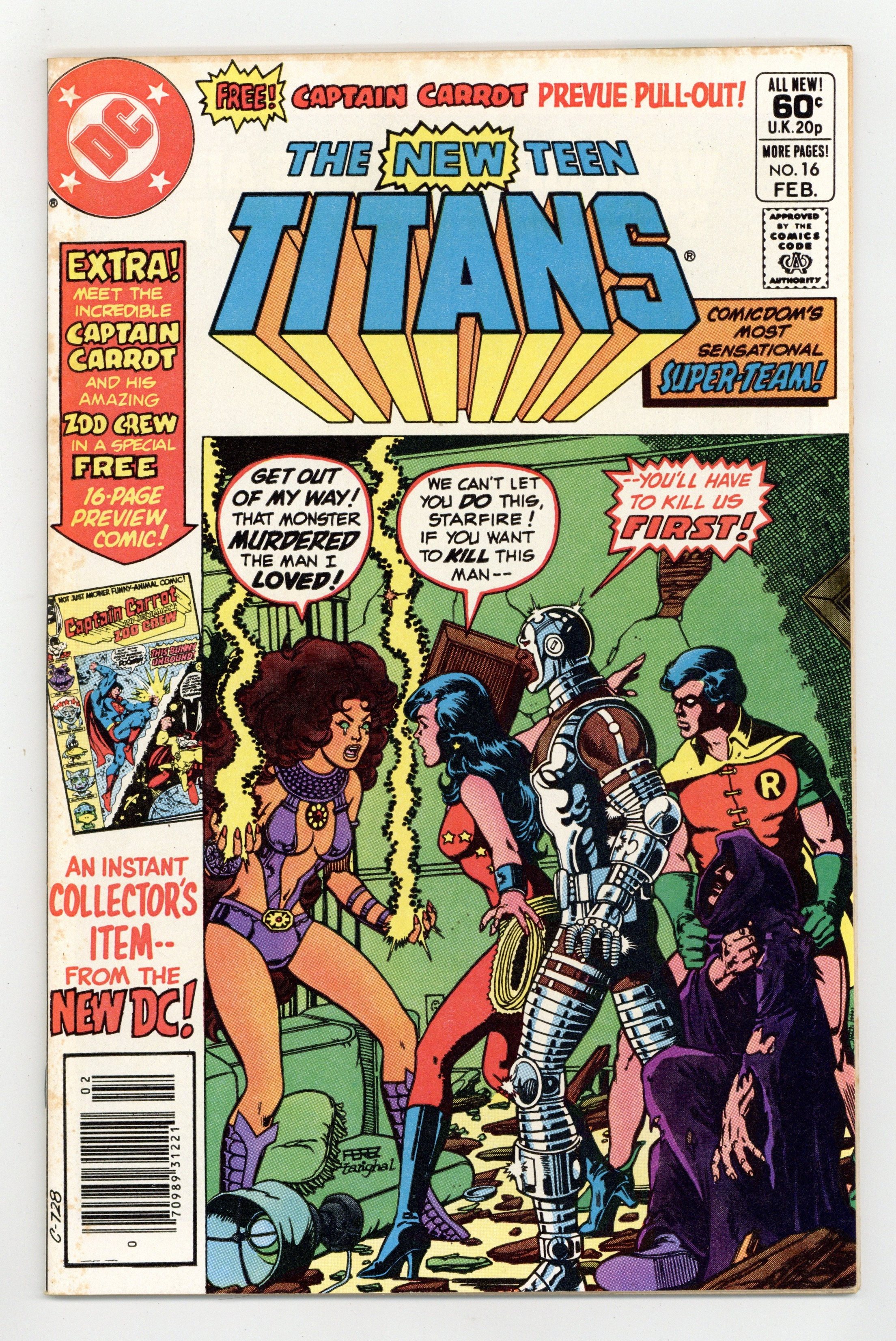 Newsstand Edition. Raven starts college, while Starfire's bubble is suddenly burst by the H.I.V.E. in "Starfire Unleashed!" Script by Marv Wolfman, pencils by George Perez, inks by Romeo Tanghal. 27 pages of story. Bonus 16-page tale: Superman encounters Captain Carrot and his Amazing Zoo Crew in "This Bunny Unbound!" Script by Roy Thomas, pencils by Scott Shaw! and Ross Andru, inks by Bob Smith. Perez/Tanghal cover. 1st appearance of Captain Carrot. Cover price $0.60.