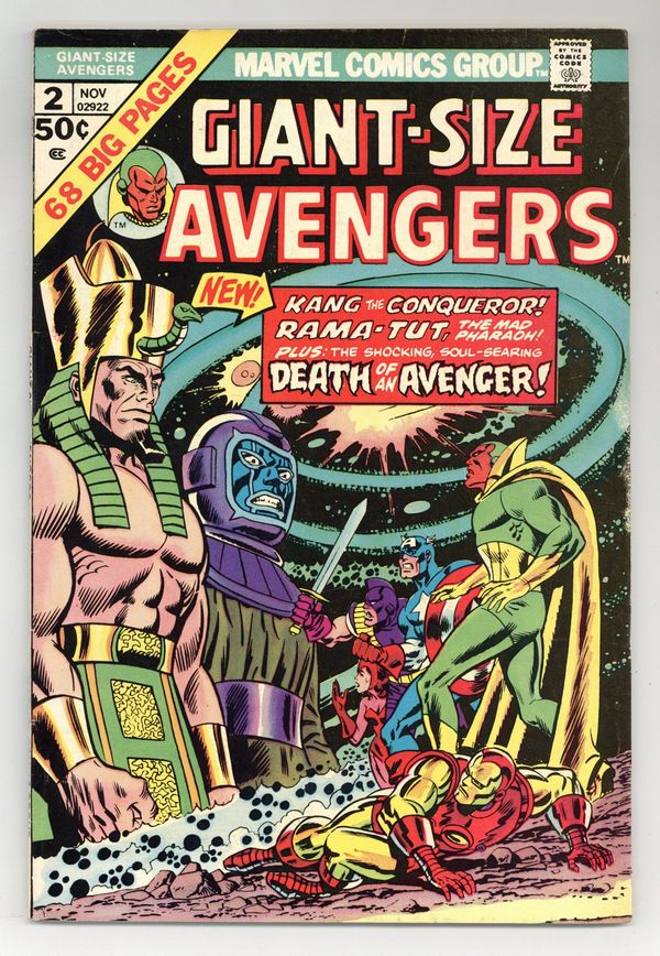 Tags: Celestial Madonna (part 2), Avengers$35.50"A Blast from the Past!" Story by Steve Englehart. Art by Dave Cockrum. Cover by Ron Wilson. The story continues from Avengers 129 and the Earth's mightiest heroes are in dire straits! Kang the Conqueror has paralyzed Iron Man, Thor, and the Vision and placed each one inside a Macrobot. Now the three Macrobots are sent to China, the Soviet Union, and the United States to wreck havoc! Kang has also imprisoned Mantis, the Scarlet Witch, and Agatha Harkness in an abandoned Egyptian pyramid as he tries to determine who is the celestial madonna. So that leaves two Avengers, Hawkeye and the Swordsman, plus the ancient pharaoh Rama-Tut to rescue the Avengers and save the world! In his finest hour with the Avengers, can the Swordsman lead the team to victory or will tragedy strike? Simply a great story with a powerful ending. Back up story: Reprint of Fantastic Four 19 (1st series) featuring Rama-Tut. 64 pages Cover price $0.50.