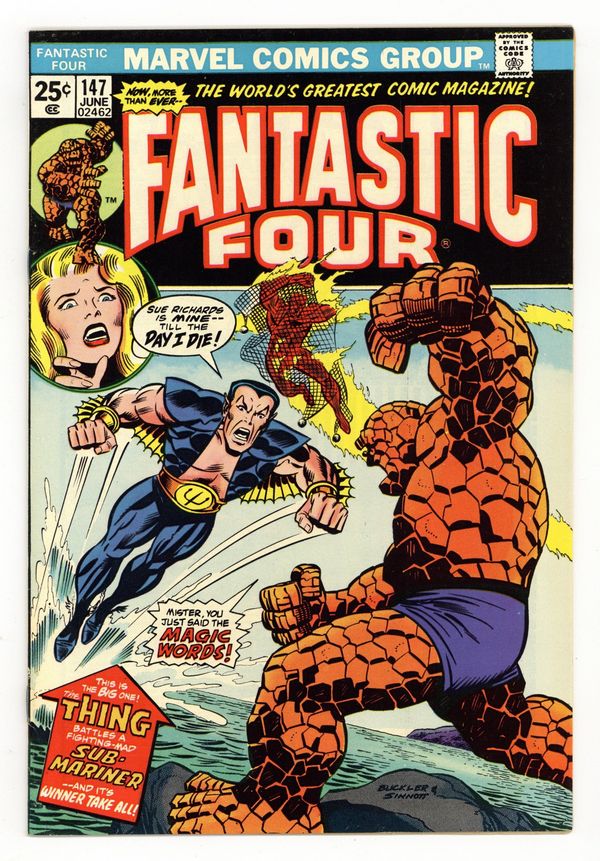"The Sub-Mariner Strikes!" Script by Gerry Conway. Art by Rich Buckler (breakdowns) and Joe Sinnott (finishes). Cover by Rich Buckler and Joe Sinnott. One of the classic FF covers of the bronze age! Shock follows shock for the Fantastic Four! First, Mr. Fantastic receives divorce papers from his estranged wife, the Invisible Girl; and second, Prince Namor reveals that both Sue and Franklin are now under the protection of the Avenging Son! And in-between those revolting developments, the Human Torch and the Thing fight a fierce battle vs. the Sub-Mariner! Wow, can things get any worse for the FF?! (Notes: The letters page includes an essay from Stan Lee and Roy Thomas concerning the recent price increase from 20¢ to 25¢. The letters page also contains Marvel Value Stamp series A #82 Mary Jane Watson by John Romita.) 36 pages Cover price $0.25.