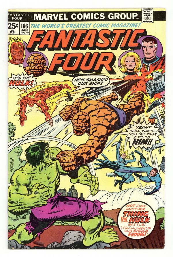 "If It's Tuesday, This Must Be The Hulk!" Part 1 of 2. Guest-starring the Hulk. Script by Roy Thomas. Pencils by George Perez. Inks by Vince Colletta. Cover by Rich Buckler and Dan Adkins. The federal government asks Reed Richards to take the Fantastic Four to the Midwest to apprehend the Hulk! Will the FF be able to find the Green Goliath? Yes! And that's were the trouble begins! However, the fabulous foursome successfully captures the Hulk and hands the behemoth over to the military. It looks like mission accomplished for the FF...until the Thing becomes dismayed over the rough treatment of Dr. Banner. Would Ben actually consider freeing the rampaging Hulk? Yes again! (Note: The letters page contains Marvel Value Stamp series B #13 Doctor Strange by Frank Brunner.) 36 pages Cover price $0.25.