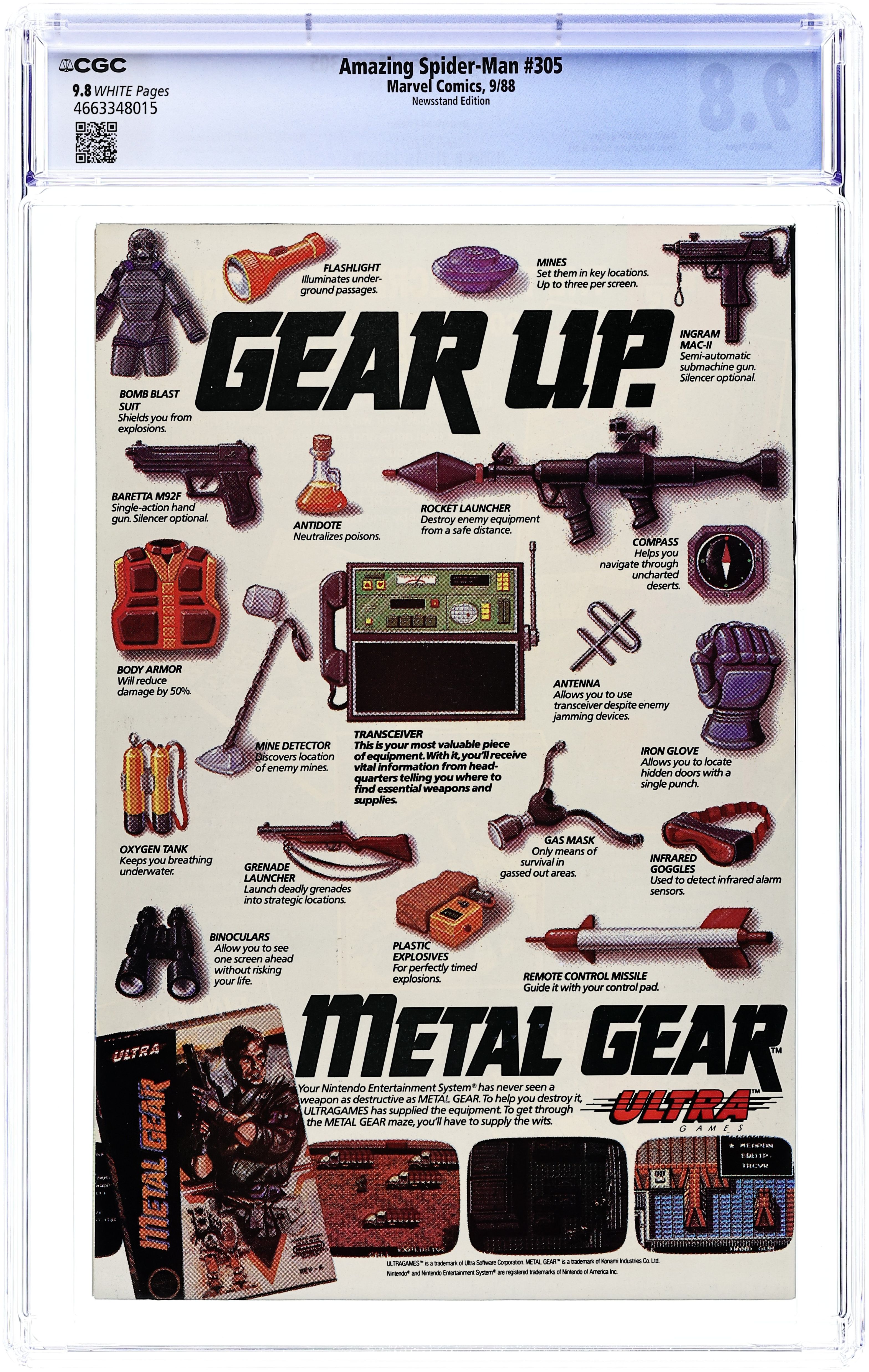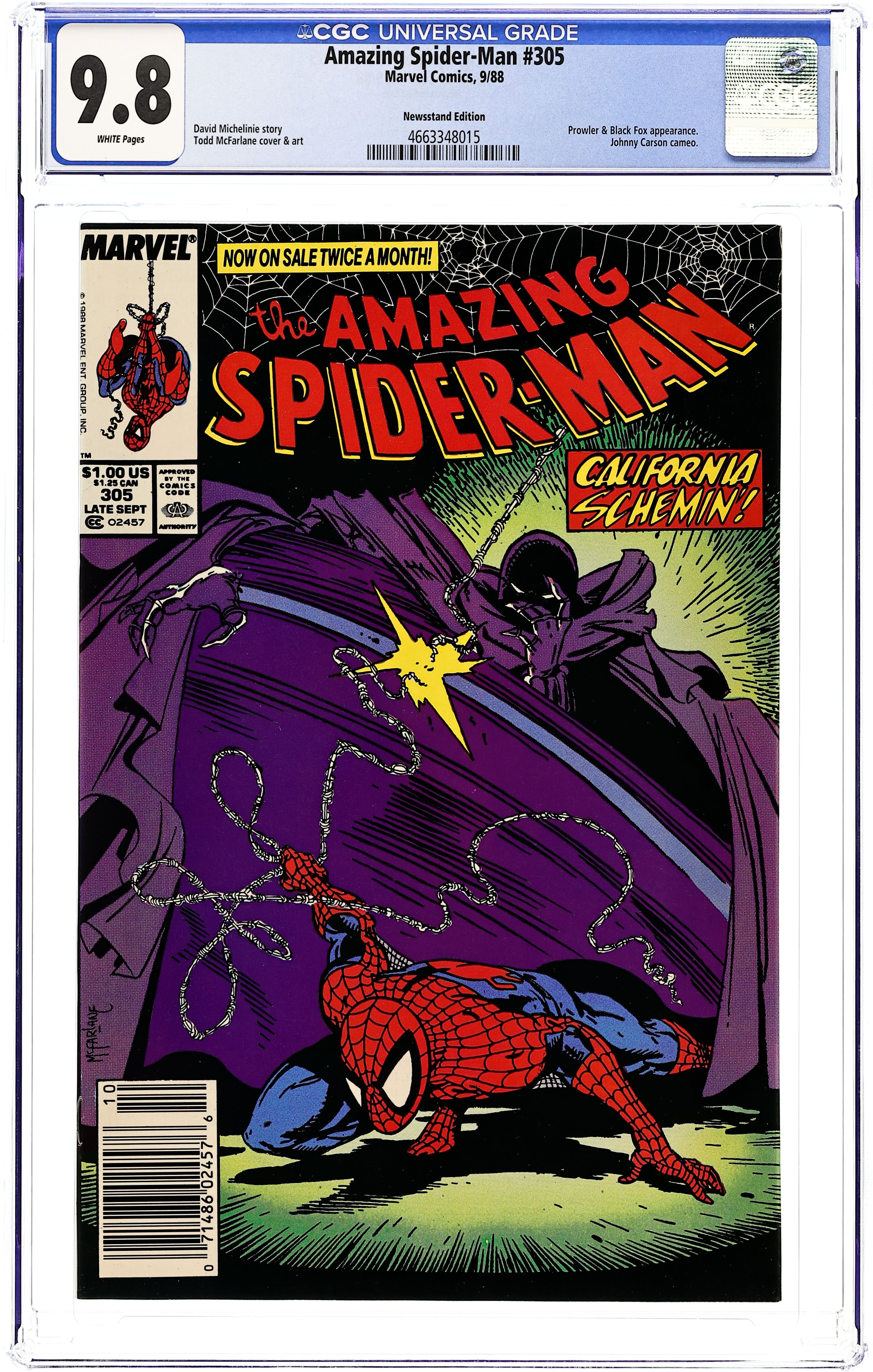 Newsstand Edition. "Westward Woe!" Part 2 of 2. Guest-starring the Prowler. Script by David Michelinie. Pencils by Todd McFarlane. Inks by Hector Collazo, Chris Ivy, Ken Lopez, Mark McKenna, Rodney Ramos, Pat Redding, and Joe Rubinstein. Cover by Todd McFarlane. In dashing fashion the Black Fox absconds with the precious chalice! And leaves the web-slinger wondering to where he disappeared! But this time there's someone else besides the wall-crawler hunting the fox! The Prowler! Hobie Brown needs the chalice to clear his wife's name in a criminal investigation! The following night at the Long Beach docks; Spider-Man, the Prowler, the Black Fox, and Transcorp's gun-toting goons come together! Who will hoist the cup of victory? Cameo appearances by Johnny Carson and Ed McMahon. (Notes: The Black Fox returns in Amazing Spider-Man 348. The Prowler formerly appeared in Spectacular Spider-Man 47.) 36 pages. Cover price $1.00.