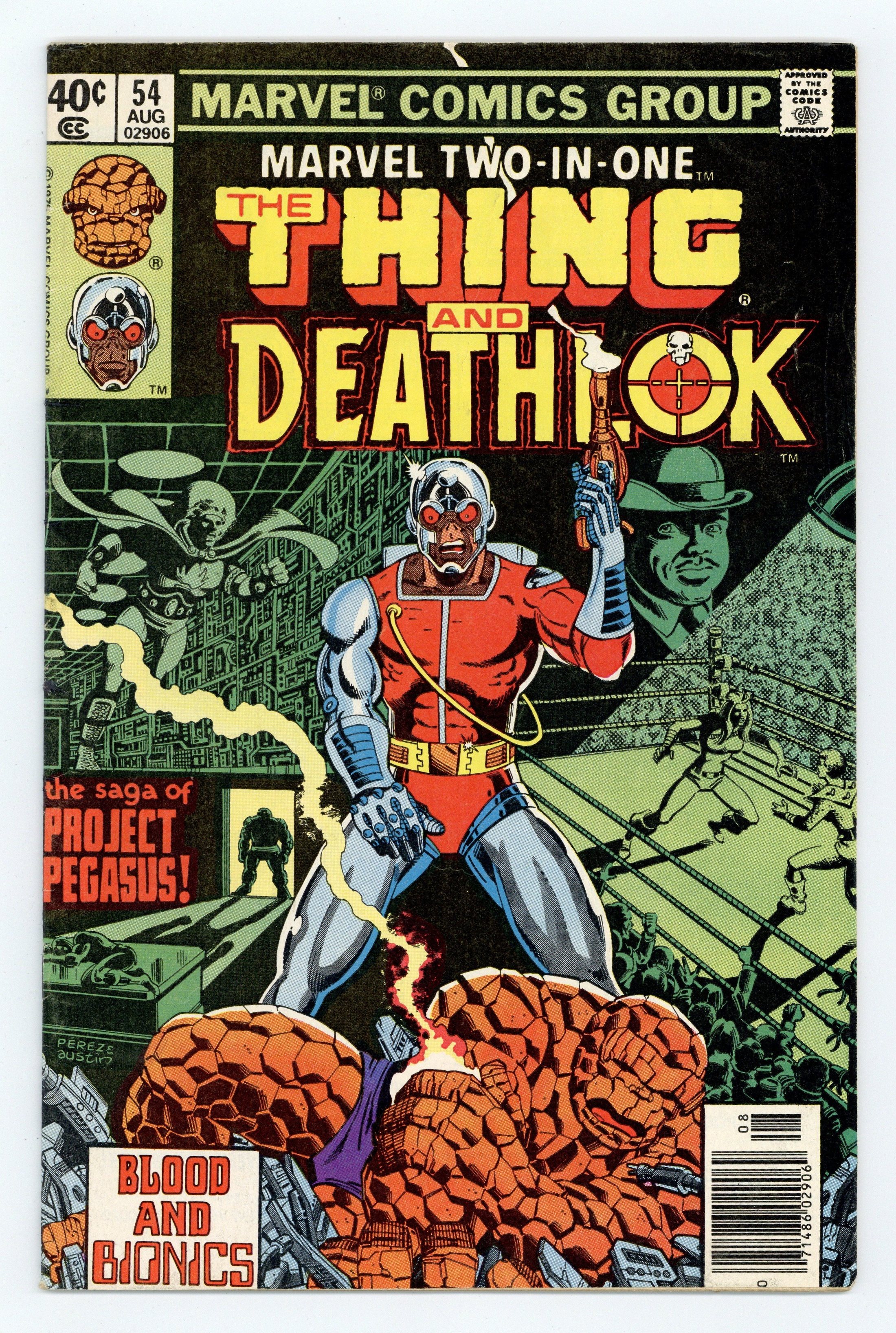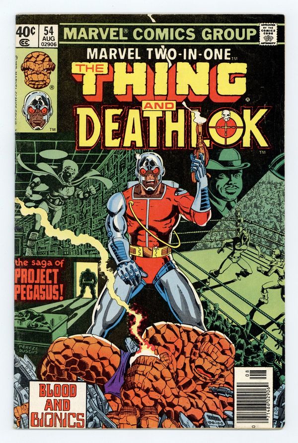 Newsstand Edition. Cover by George Pérez and Terry Austin. The Pegasus Project. Part 2 of 6. "Blood and Bionics!" Guest-starring Deathlok and Quasar. Thundra cameo. Story by Mark Gruenwald and Ralph Macchio. Art by John Byrne and Joe Sinnot. Can even the combined might of the Thing and Quasar take down the cybernetic killer from the future known as Deathlok? Plus beware, there is betrayal at Project: Pegasus. Cover price $0.40.