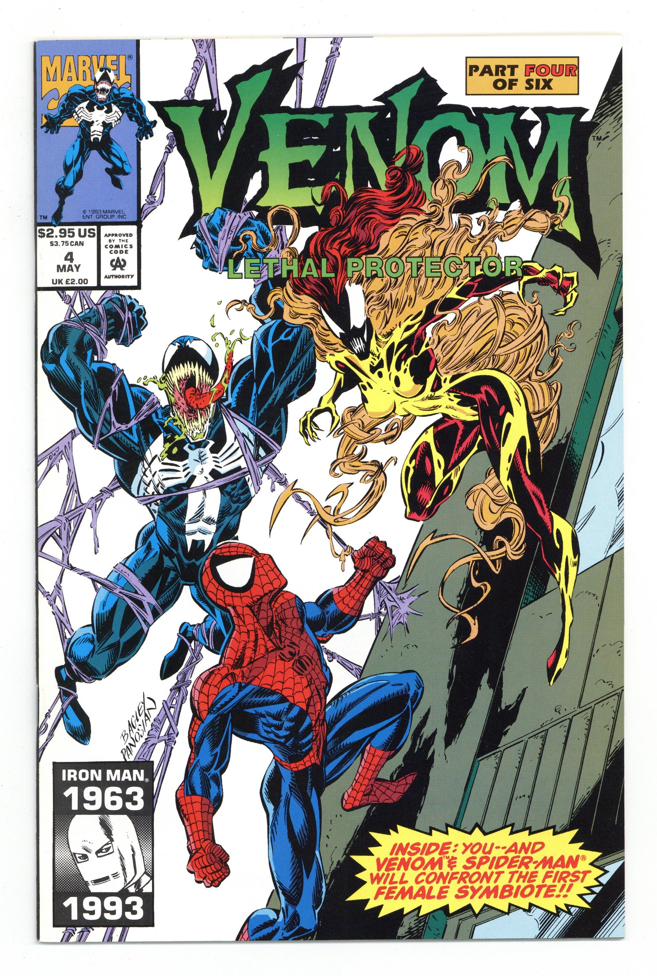 Tags: Marvel Legacy Numbering: Venom (part 4), Spider-Man$6.80Direct Edition. The first female symbiote enters the scene! Spider-Man and Venom confront the Life Foundation's master plan, when a new killer symbiote is born. Written by David Michelinie. Art by Ron Lim, Sam de la Rosa and Al Milgrom. Cover by Mark Bagley and Dan Panosian. Cover price $2.95.