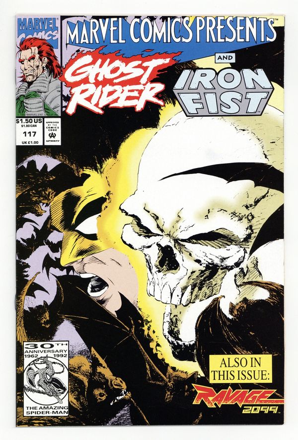 $16.25Direct Edition. Cover art by Steve Lightle. Claws and Webs Part 1: Dream A Little Dream of Me starring Wolverine and Venom, script by Howard Mackie, art by Sam Kieth. Rest and Sweet Glory Part 5: Grand Unification starring Giant-Man, script by Dwayne McDuffie, pencils by Ron Wilson, inks by Ken Branch. Legion of Vengeance Part 5: A World of D'Kay starring Ghost Rider and Iron Fist, script by Joey Cavalieri, art by Shawn McManus. This Madness Unleashed starring Ravage 2099, script by Stan Lee, art by Paul Ryan. 36 pgs. Cover price $1.50.