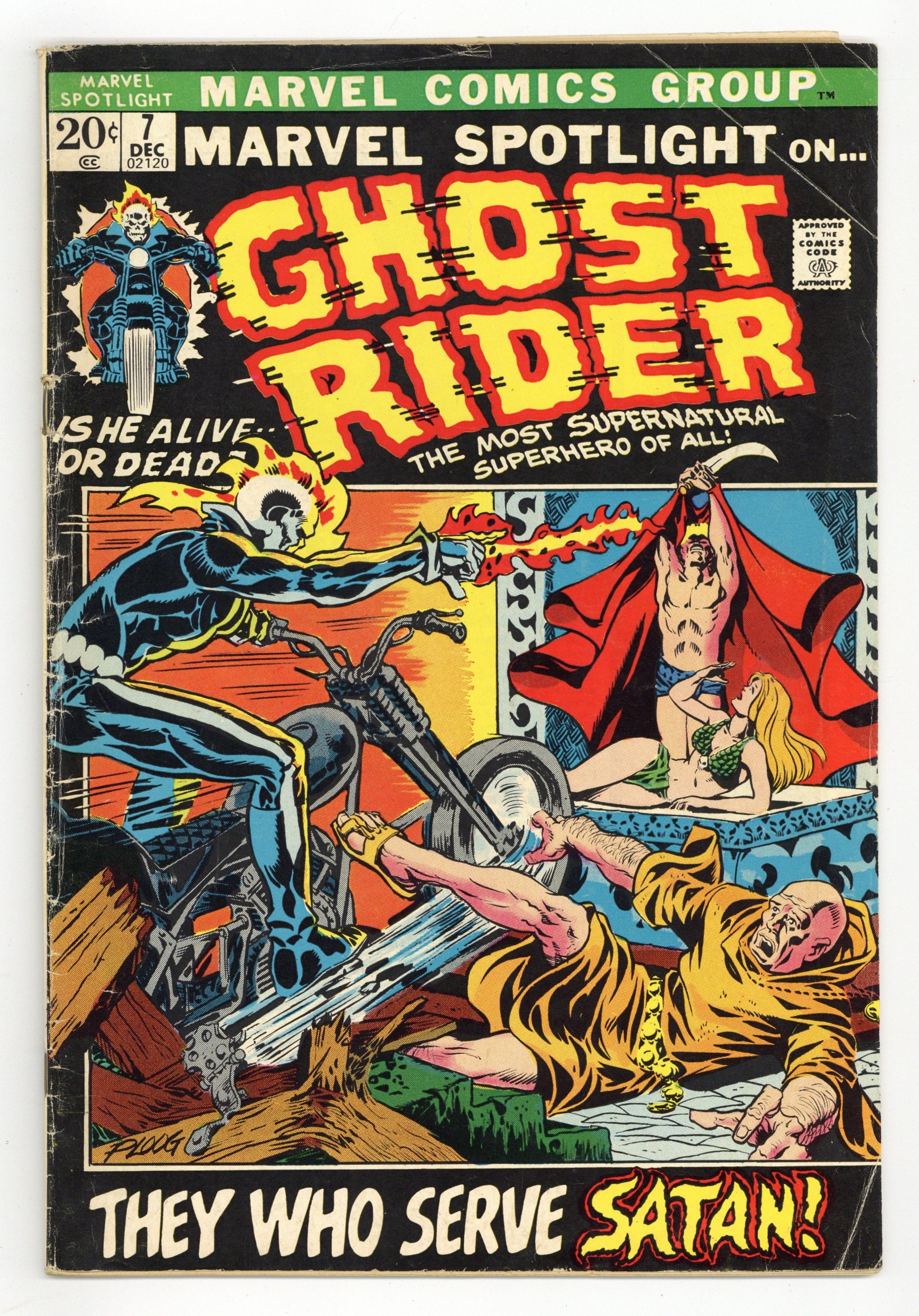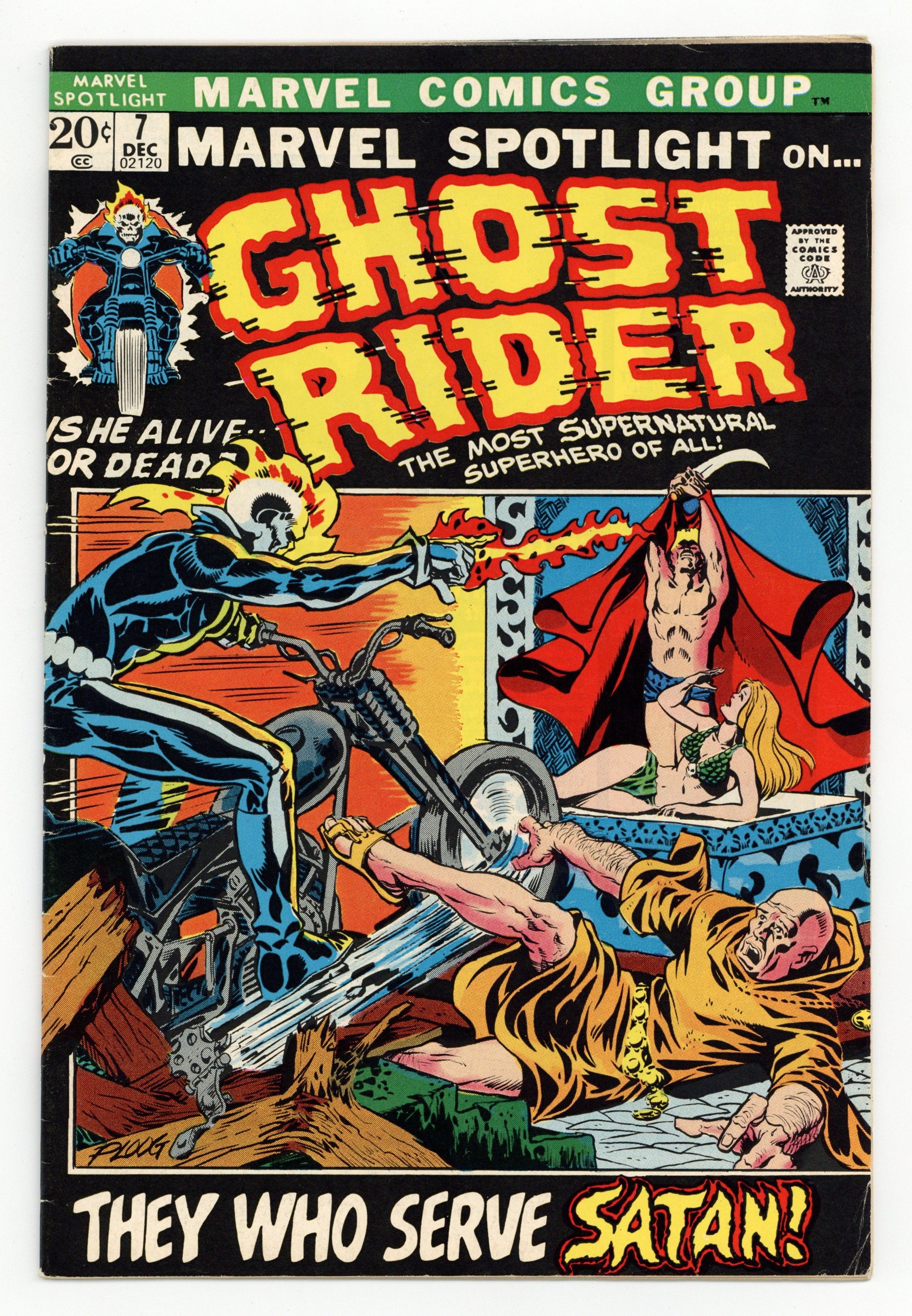 Cover art by Mike Ploog. Die, Die, My Daughter, script by Gary Friedrich, pencils by Mike Ploog, inks by Frank Chiaramonte; Curly, the leader of the biker gang Satans Saints, tries to sacrifice Roxanne to Satan; cops chase Ghost Rider, who stops to rest in a graveyard. 36 pages, full color. Cover price $0.20.